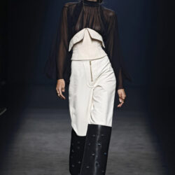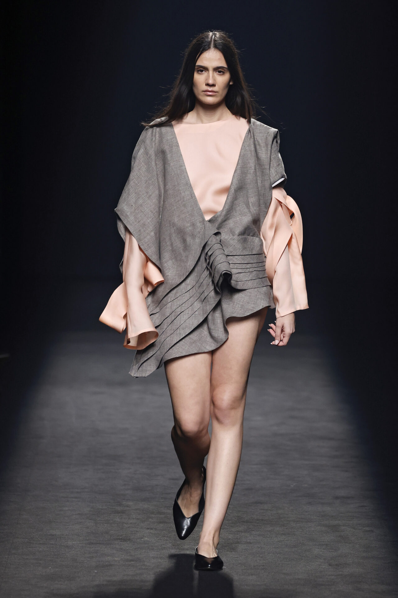 La colección se distingue por su audaz exploración de formas y volúmenes. Las prendas presentan siluetas arquitectónicas y estructuras voluminosas que desafían las convenciones tradicionales. Desde vestidos etéreos con pliegues dramáticos hasta blusas con mangas amplias y faldas con volúmenes sorprendentes, cada diseño ofrece una experiencia visual única, combinando comodidad con un estilo vanguardista