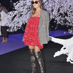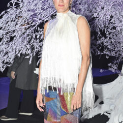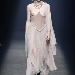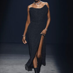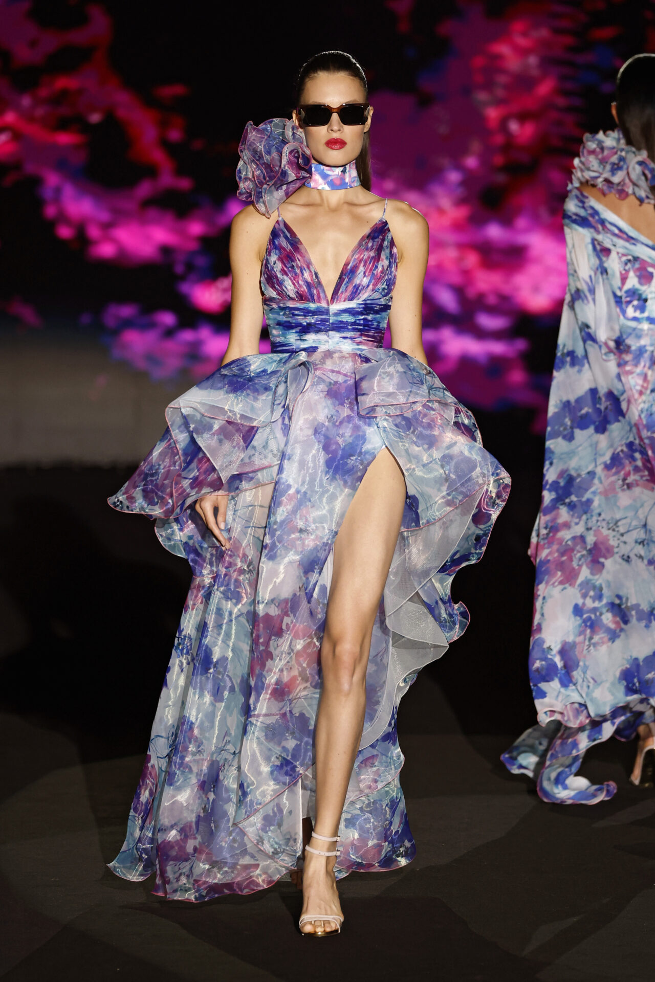 Mientras los estampados florales se mimetizan con bordados y minúsculos pétalos espejados para embellecer looks con delicados efectos tridimensionales, los tableados y drapeados de muselina realizados a mano esculpen el torso de vestidos con formas geométricas a modo de enrejados de cristal.