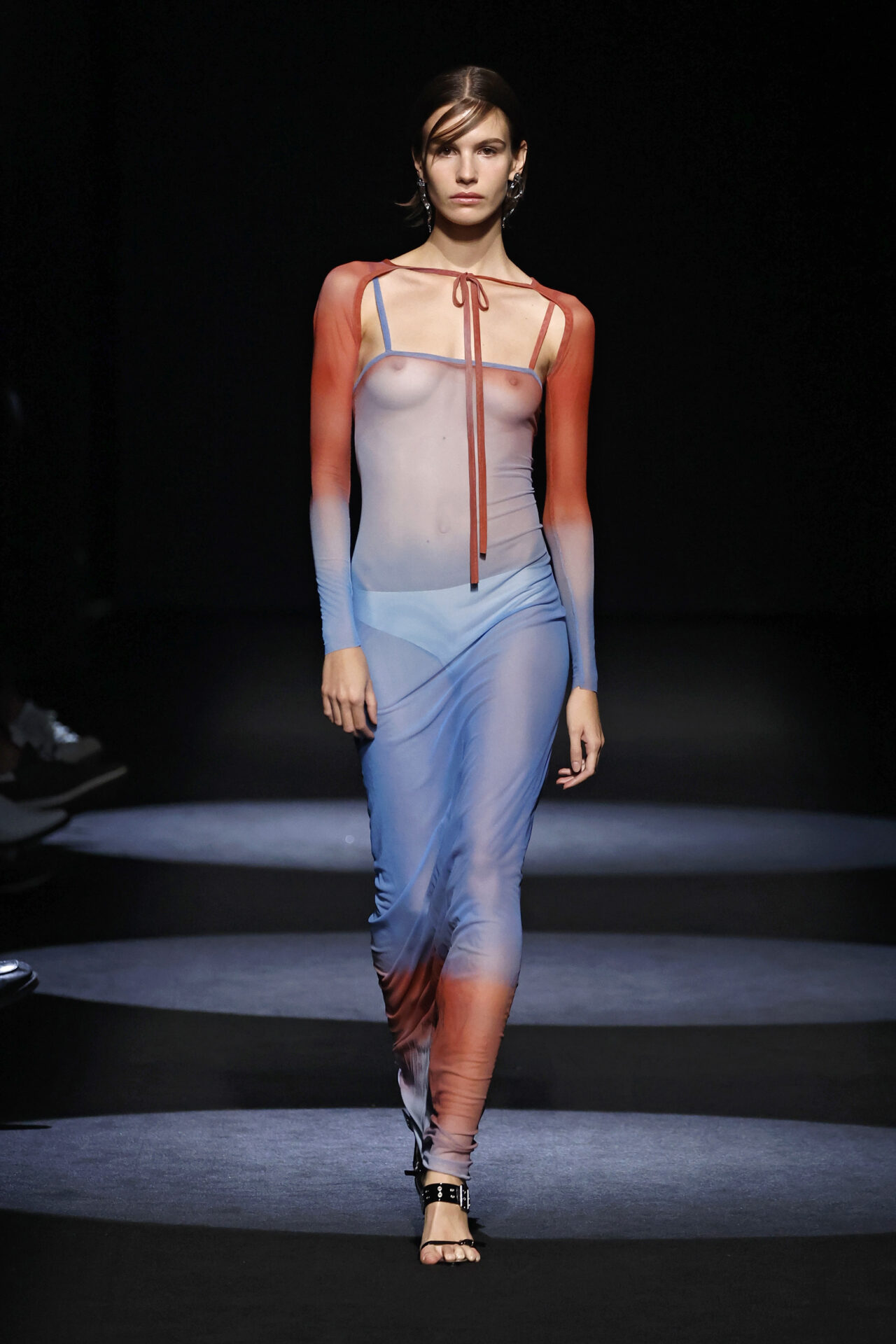 Los códigos de la colección SUNFLOURISH se declinan por entallar la cintura como eje de la silueta, acentuando la cadera y dejando al descubierto los hombros, mientras las capas de tejidos etéreos flotan entre sutiles gasas traslúcidas que revelan el trazo del paso al caminar