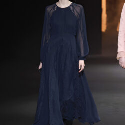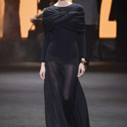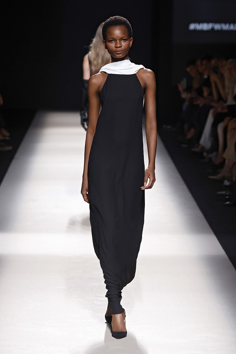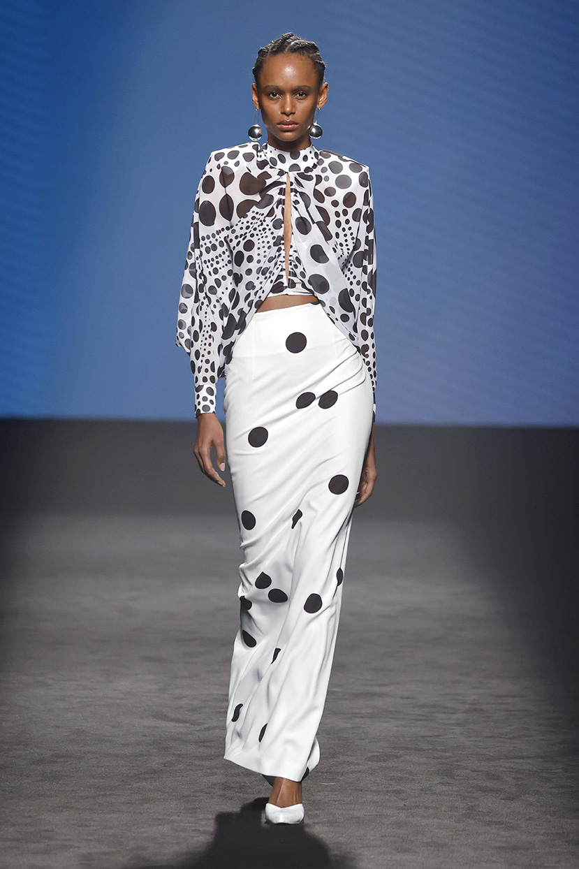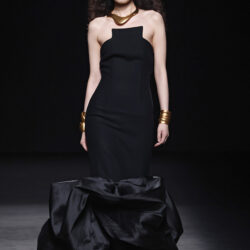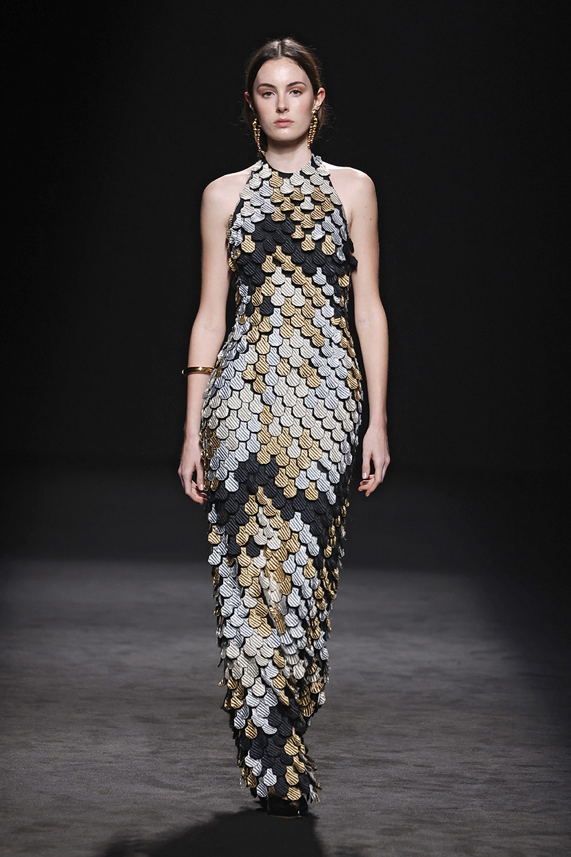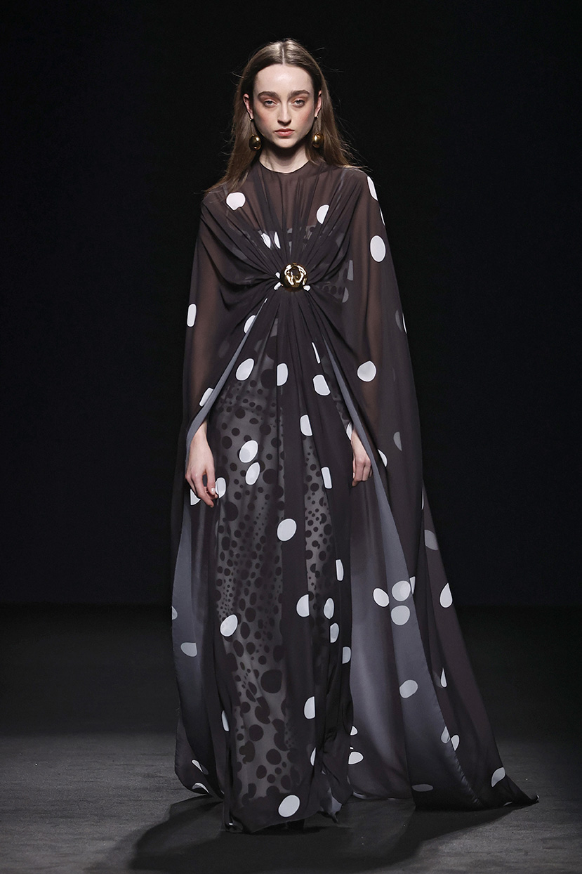 Los tejidos seleccionados –sedas delicadas, crepé estructurado, triacetato y chantilly– son toda una declaración de intenciones. Cada pieza está diseñada para ofrecer movimiento, textura y una sensación de lujo, redefiniendo la elegancia contemporánea. Una paleta de colores en evolución, que comienza con el blanco y negro clásico, para luego desplegarse en tonos matizados como los tonos metálicos, el verde eucalipto, el azul porcelana y el rosa pálido.