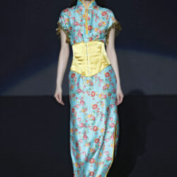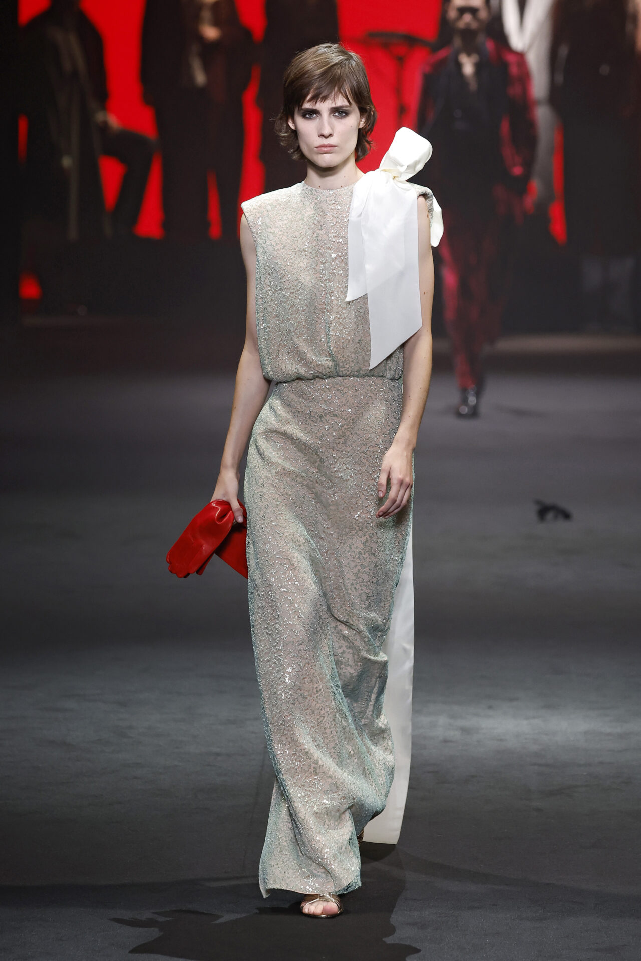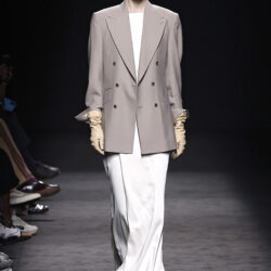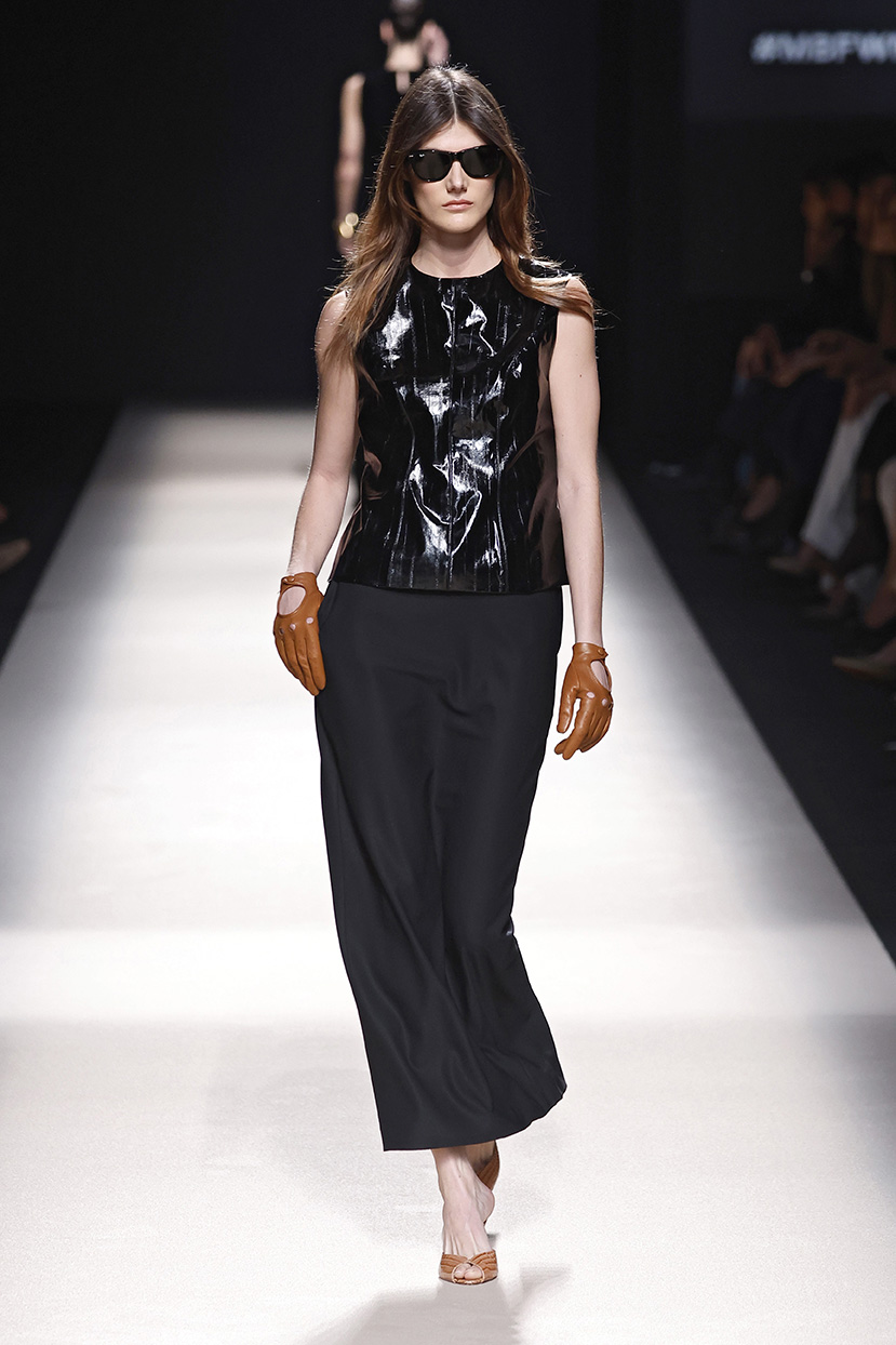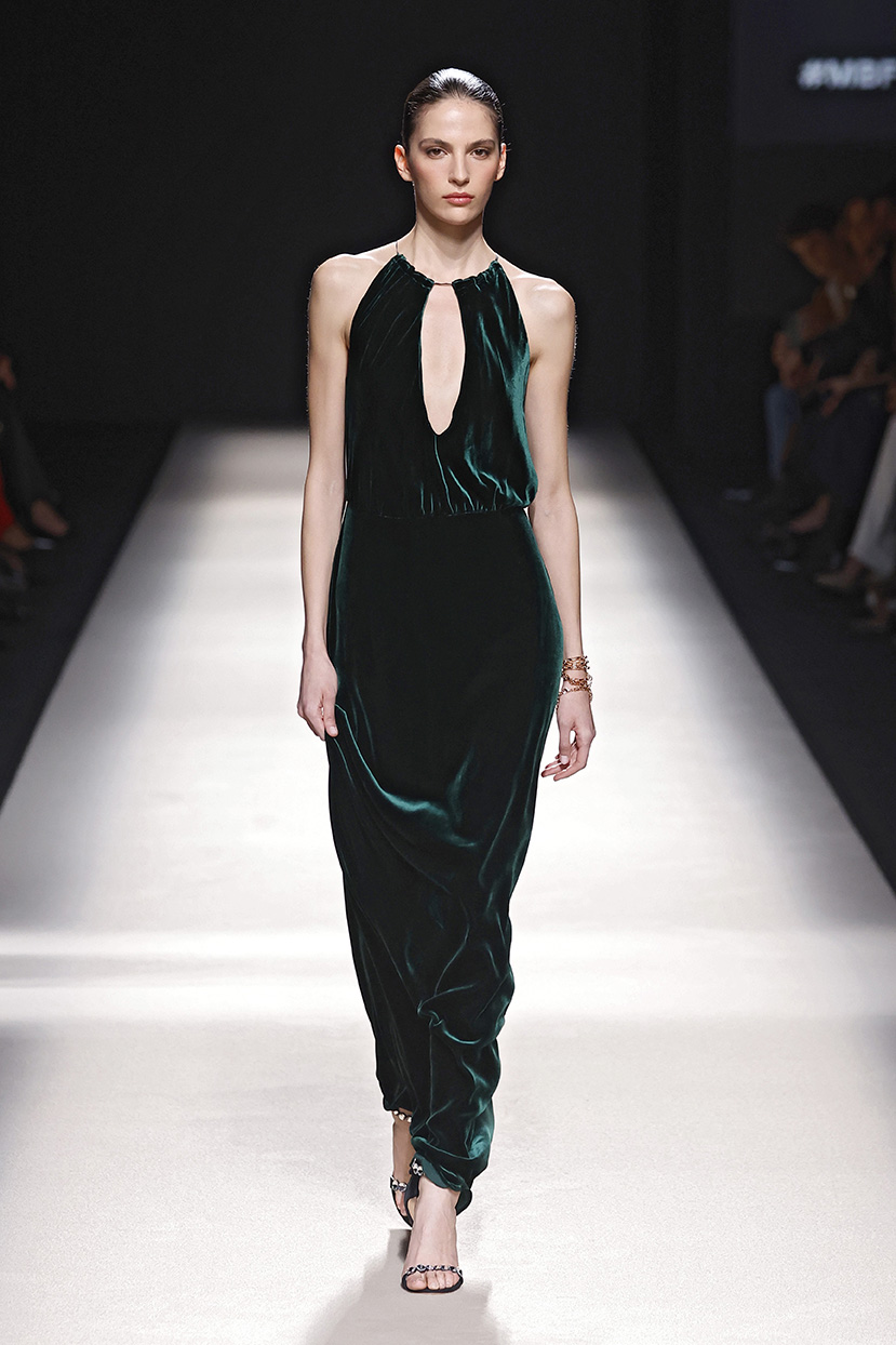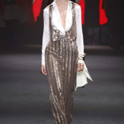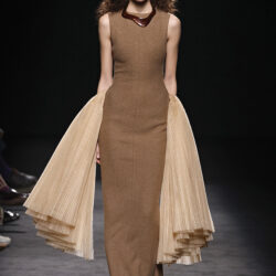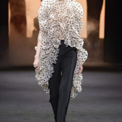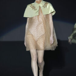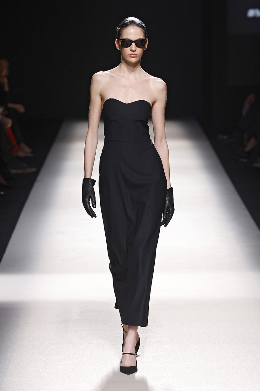 Los tejidos seleccionados –sedas delicadas, crepé estructurado, triacetato y chantilly– son toda una declaración de intenciones. Cada pieza está diseñada para ofrecer movimiento, textura y una sensación de lujo, redefiniendo la elegancia contemporánea. Una paleta de colores en evolución, que comienza con el blanco y negro clásico, para luego desplegarse en tonos matizados como los tonos metálicos, el verde eucalipto, el azul porcelana y el rosa pálido.