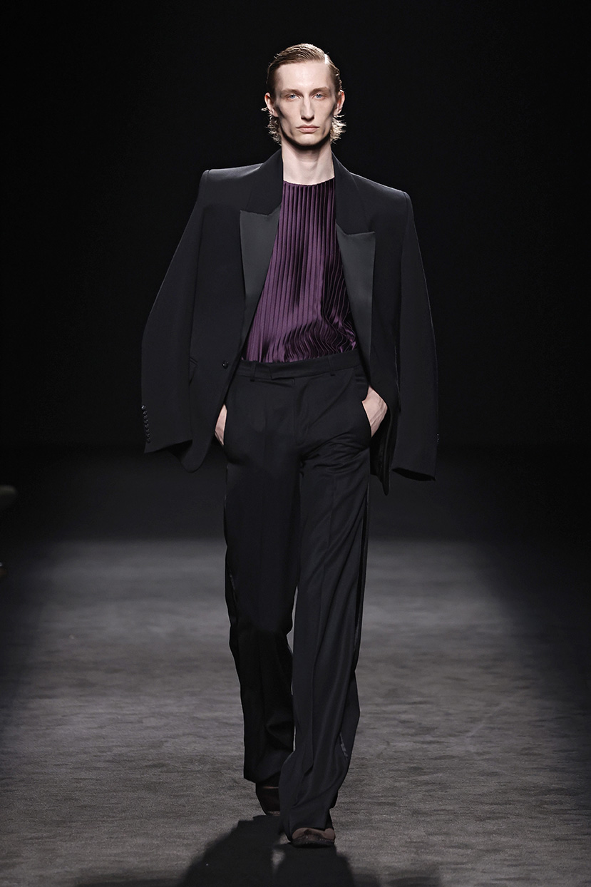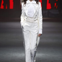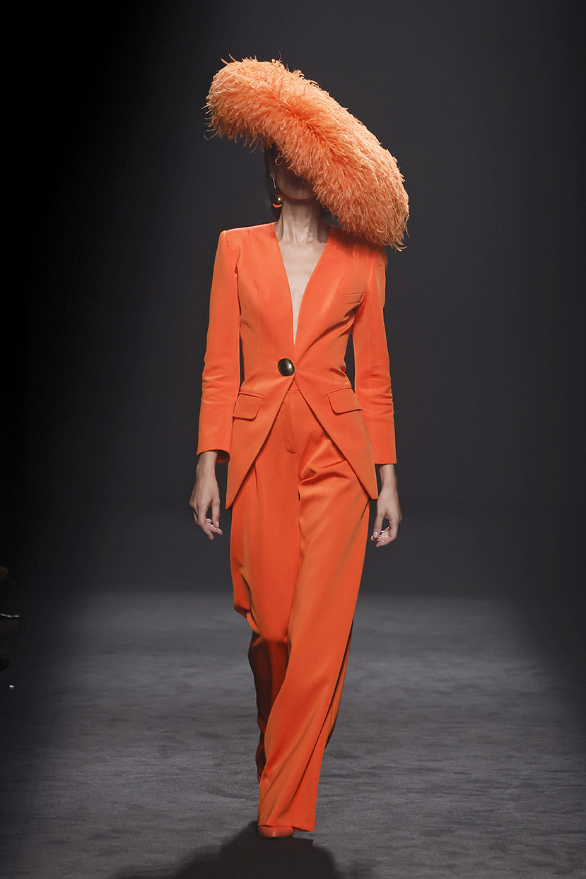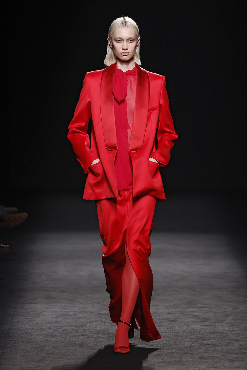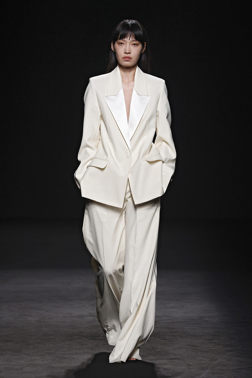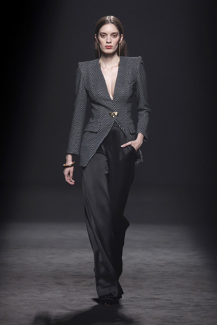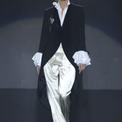 Los códigos de la sastrería masculina se aplican a las prendas femeninas, confrontando prendas como el smoking con pantalones rectos, acampanados o incluso pitillo.
