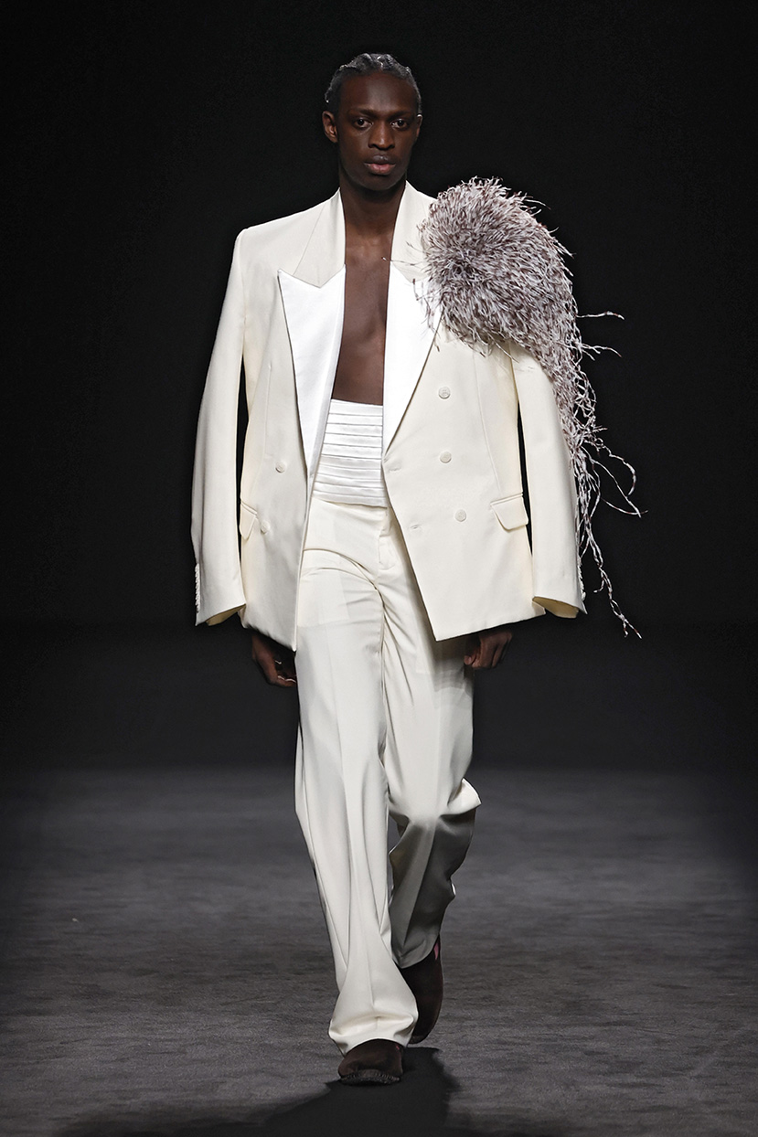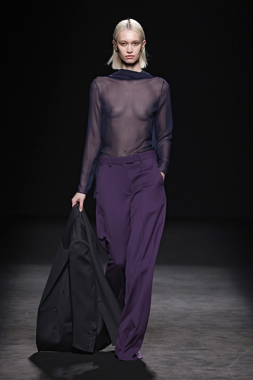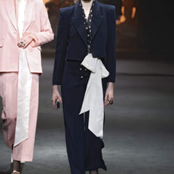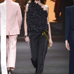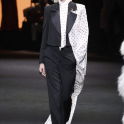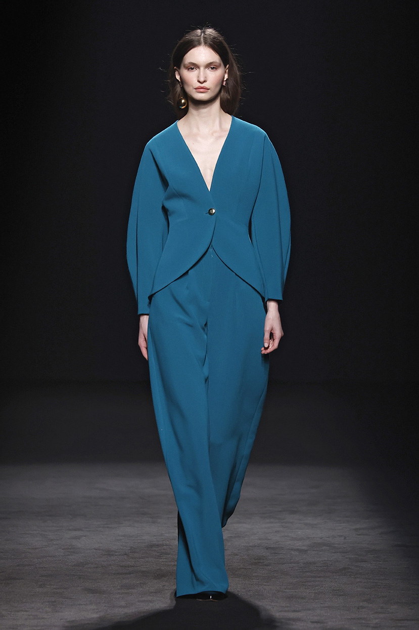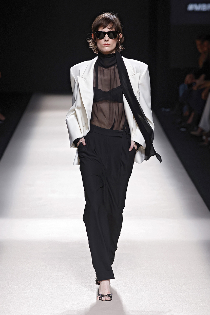 Los códigos de la sastrería masculina se aplican a las prendas femeninas, confrontando prendas como el smoking con pantalones rectos, acampanados o incluso pitillo.