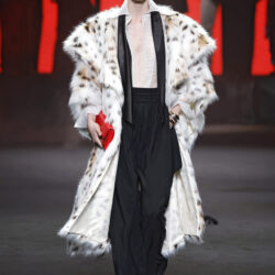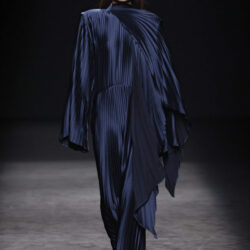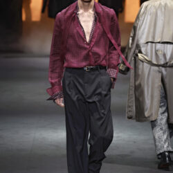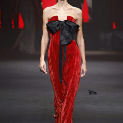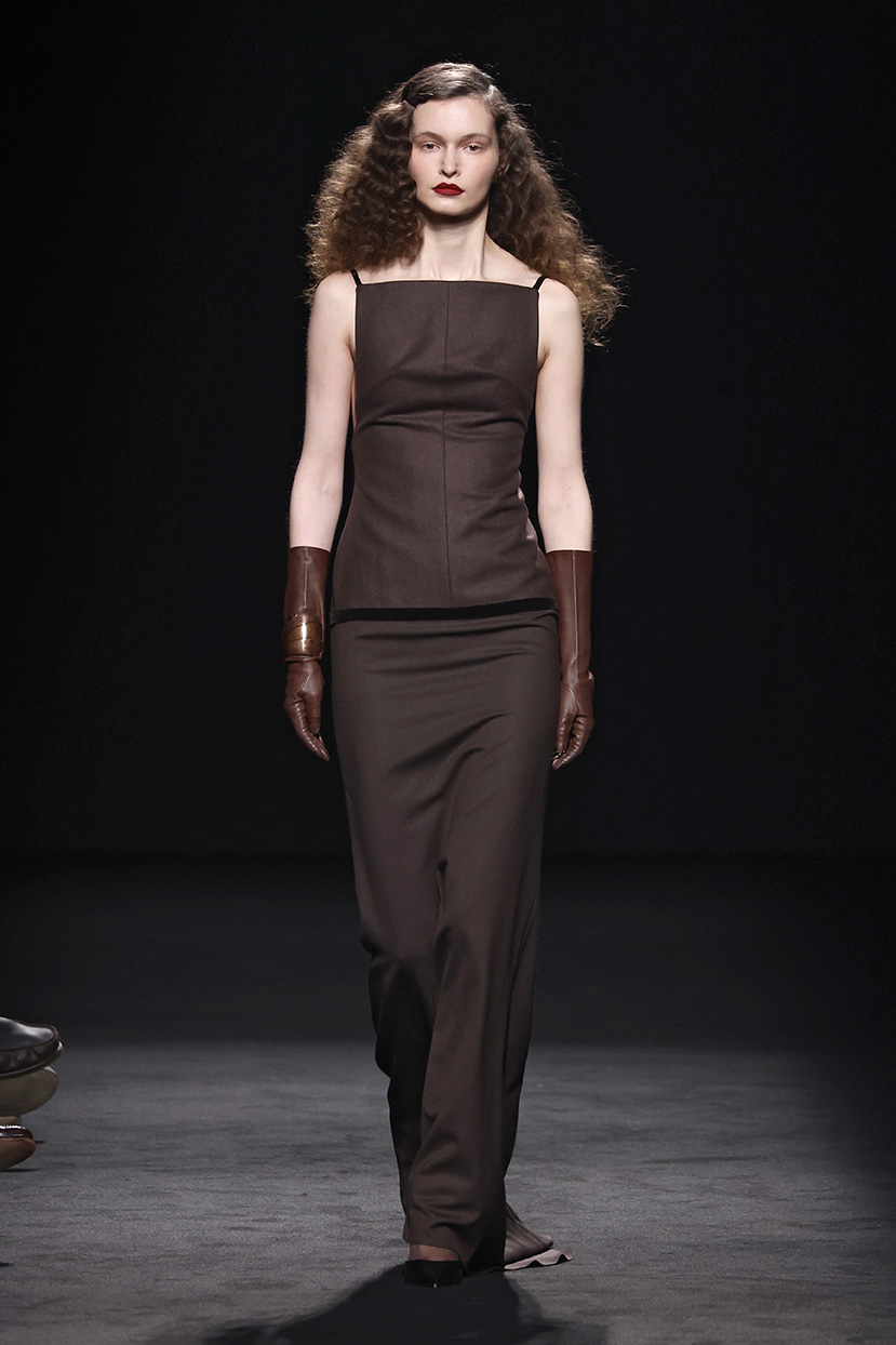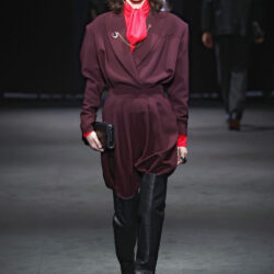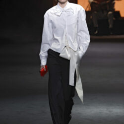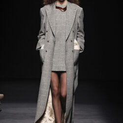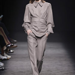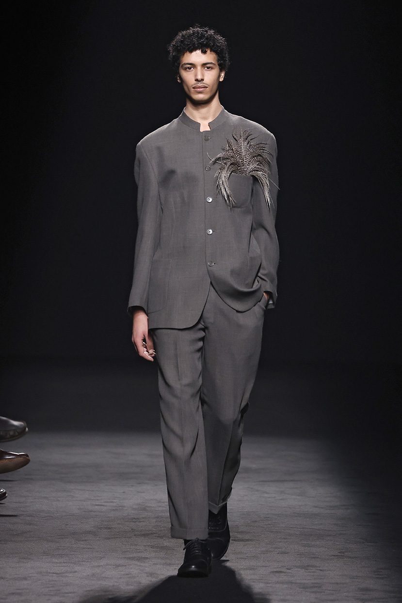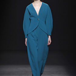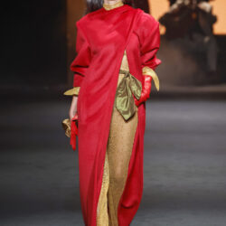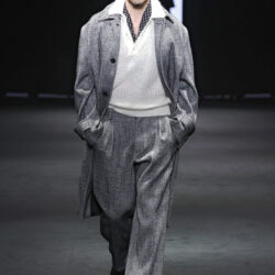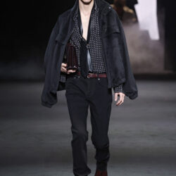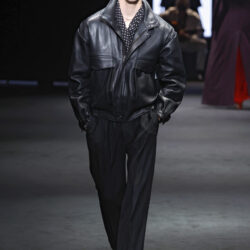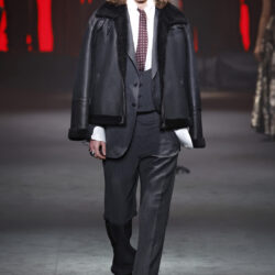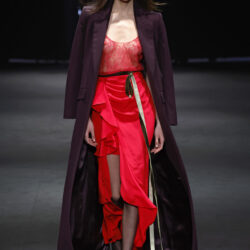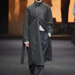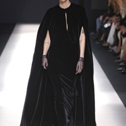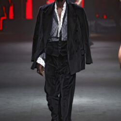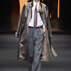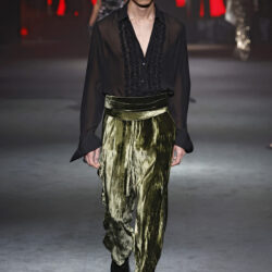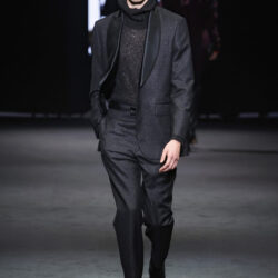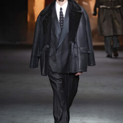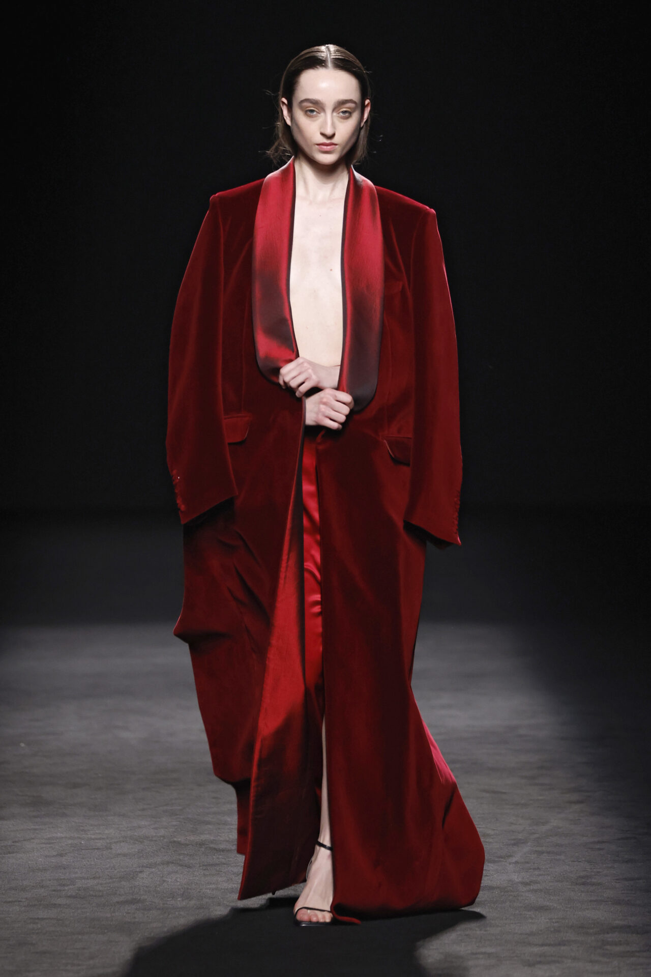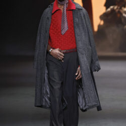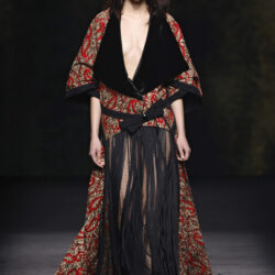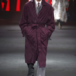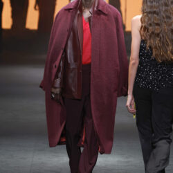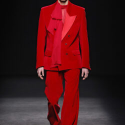 Entre los tejidos protagonistas destacan las lanas mezcladas con otros materiales como la seda y el mohair. Así, la riqueza de estas texturas contrasta con la oscuridad del propio desfile, especialmente en el uso del terciopelo con acabados como el stropicciato en rojo, negro y caqui. También hacen acto de presencia los tejidos metalizados para dar ese contraste de luz a través de las capas. Los colores predominantes, empezando y acabando en el negro más rotundo, oscilan entre el rojo burdeos o el caldero, rotos por algún que otro tono luminoso.