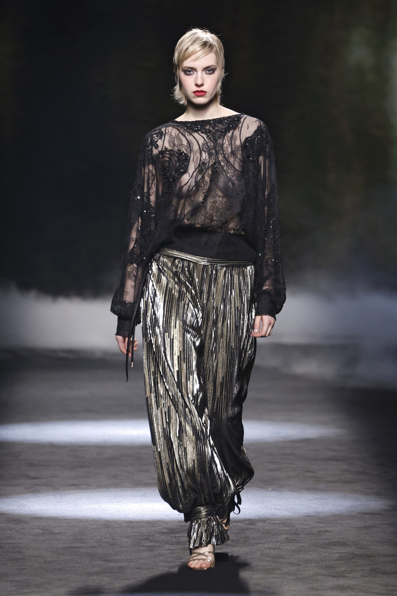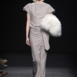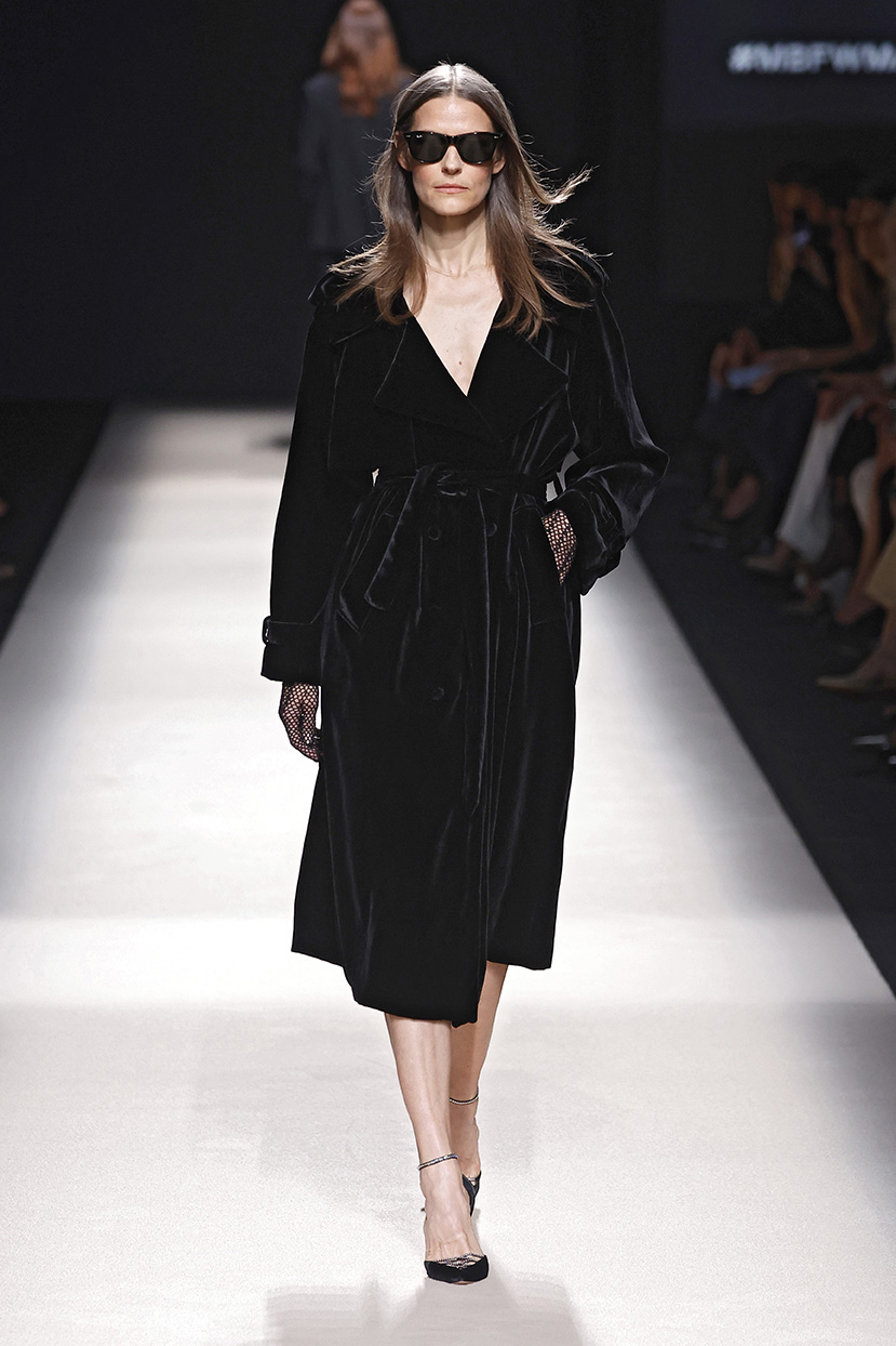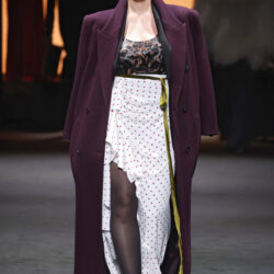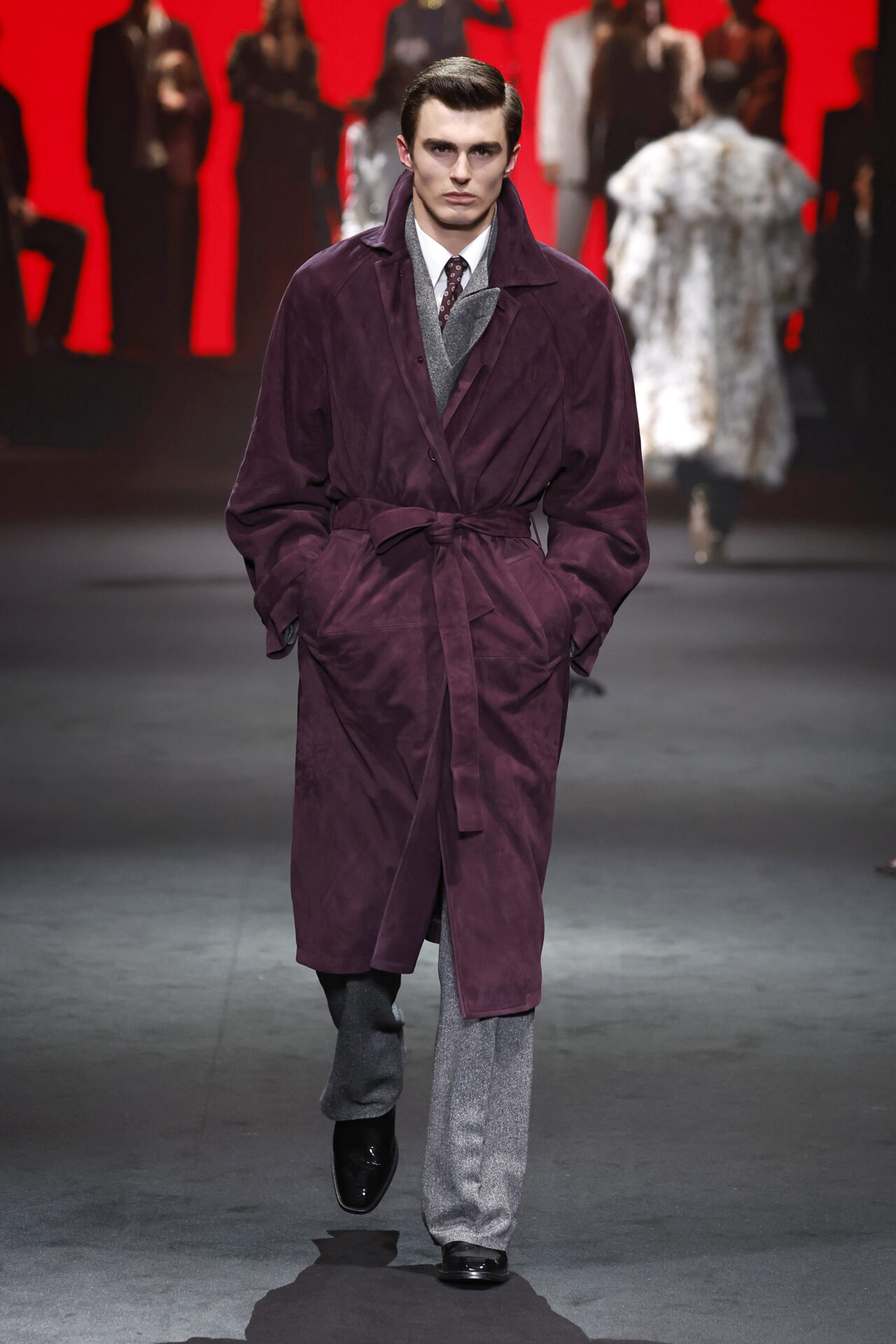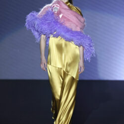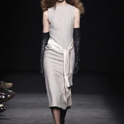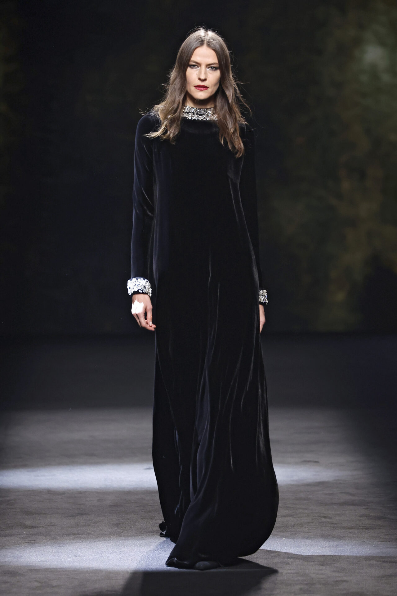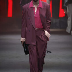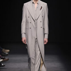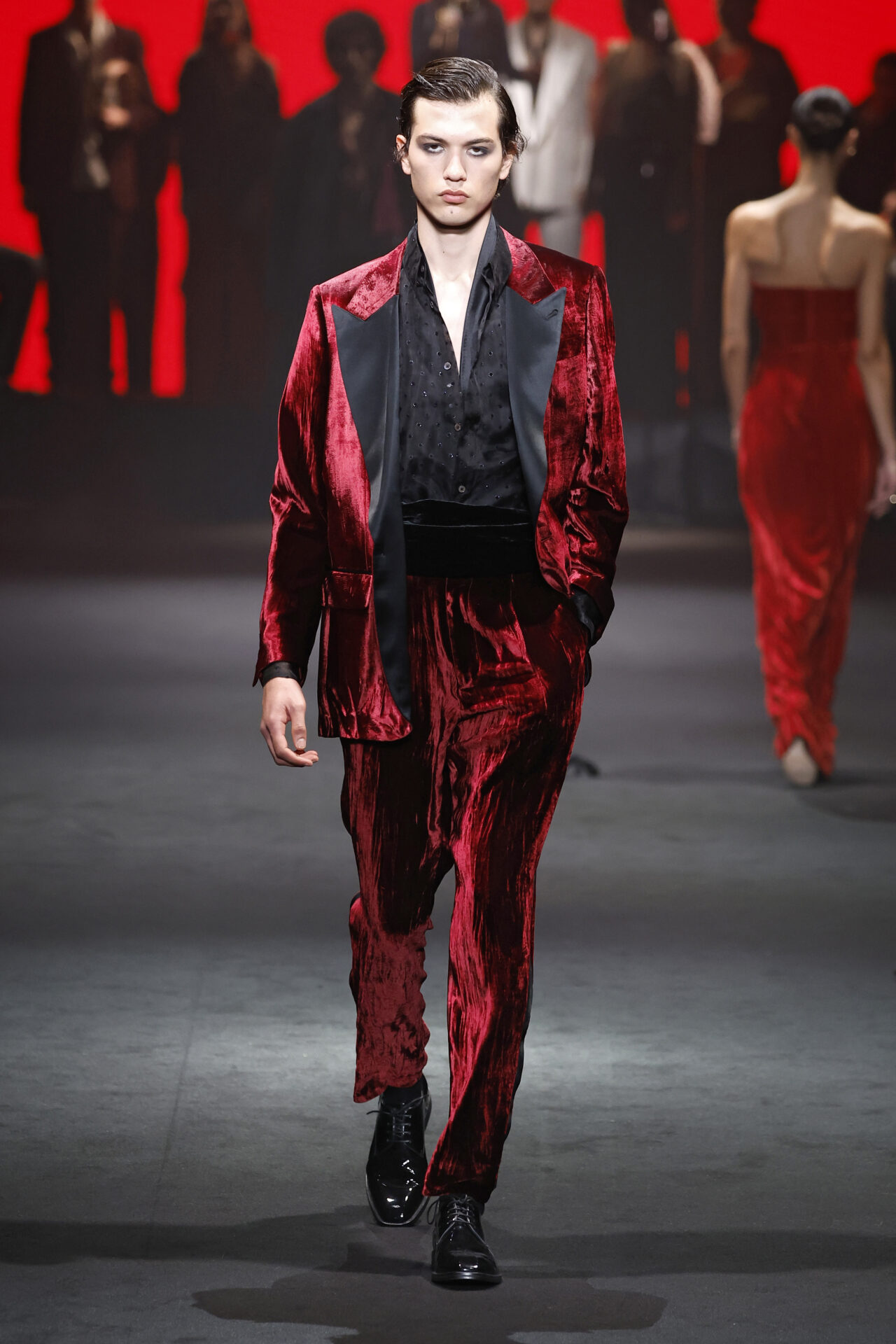 Entre los tejidos protagonistas destacan las lanas mezcladas con otros materiales como la seda y el mohair. Así, la riqueza de estas texturas contrasta con la oscuridad del propio desfile, especialmente en el uso del terciopelo con acabados como el stropicciato en rojo, negro y caqui. También hacen acto de presencia los tejidos metalizados para dar ese contraste de luz a través de las capas. Los colores predominantes, empezando y acabando en el negro más rotundo, oscilan entre el rojo burdeos o el caldero, rotos por algún que otro tono luminoso.