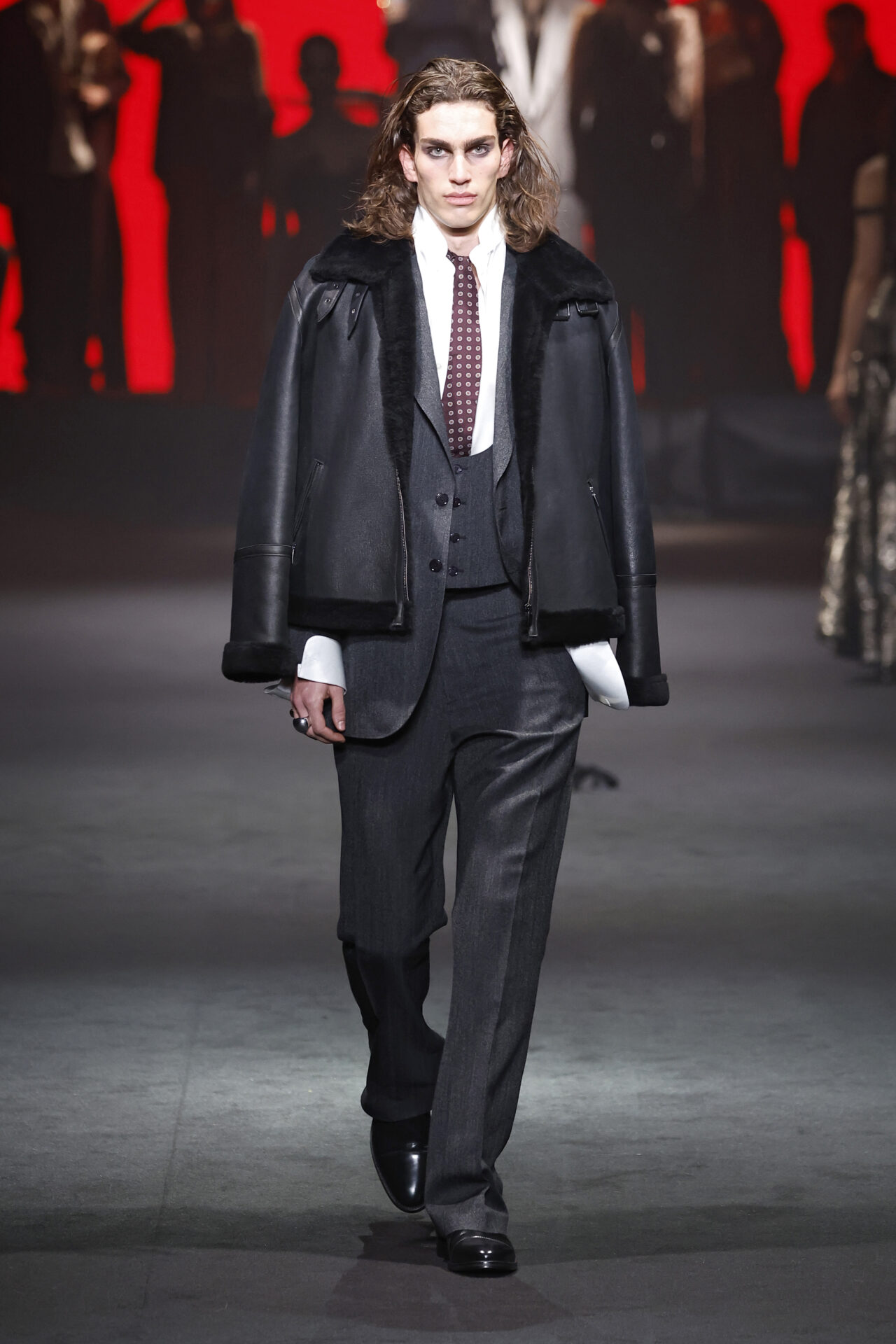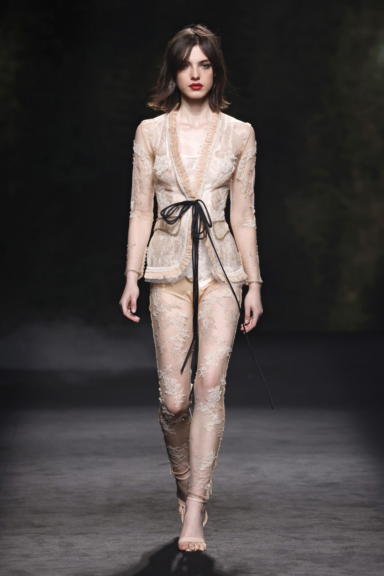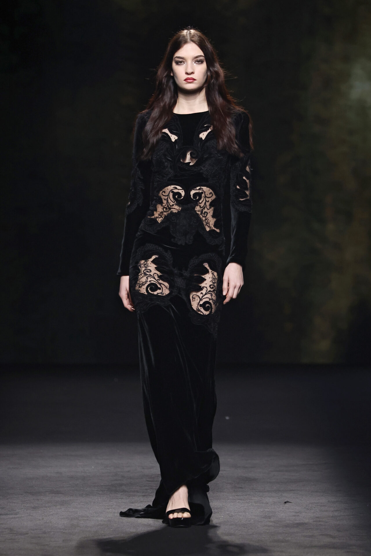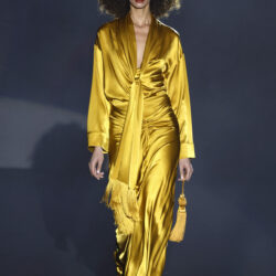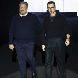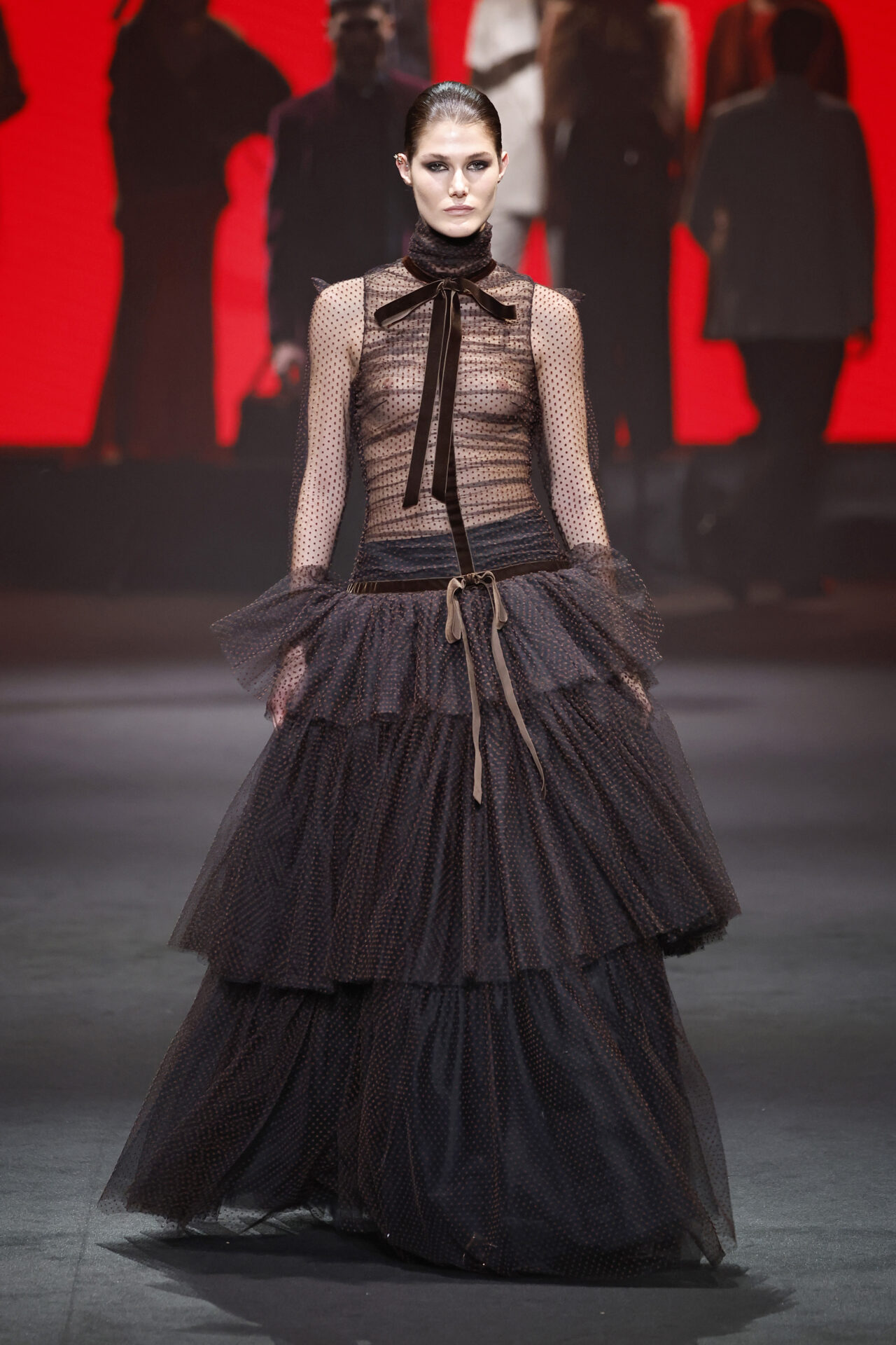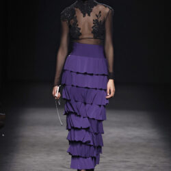 Entre los tejidos protagonistas destacan las lanas mezcladas con otros materiales como la seda y el mohair. Así, la riqueza de estas texturas contrasta con la oscuridad del propio desfile, especialmente en el uso del terciopelo con acabados como el stropicciato en rojo, negro y caqui. También hacen acto de presencia los tejidos metalizados para dar ese contraste de luz a través de las capas. Los colores predominantes, empezando y acabando en el negro más rotundo, oscilan entre el rojo burdeos o el caldero, rotos por algún que otro tono luminoso.