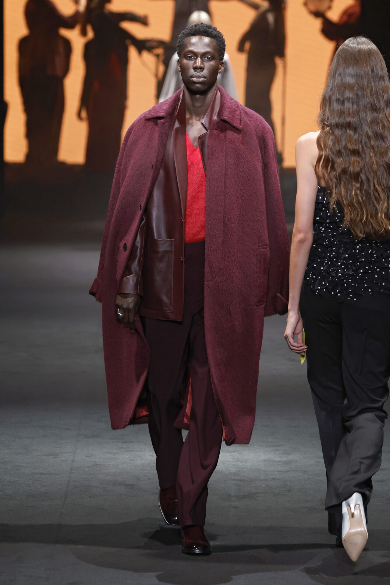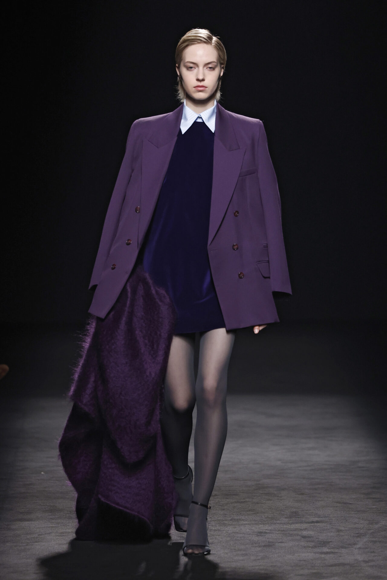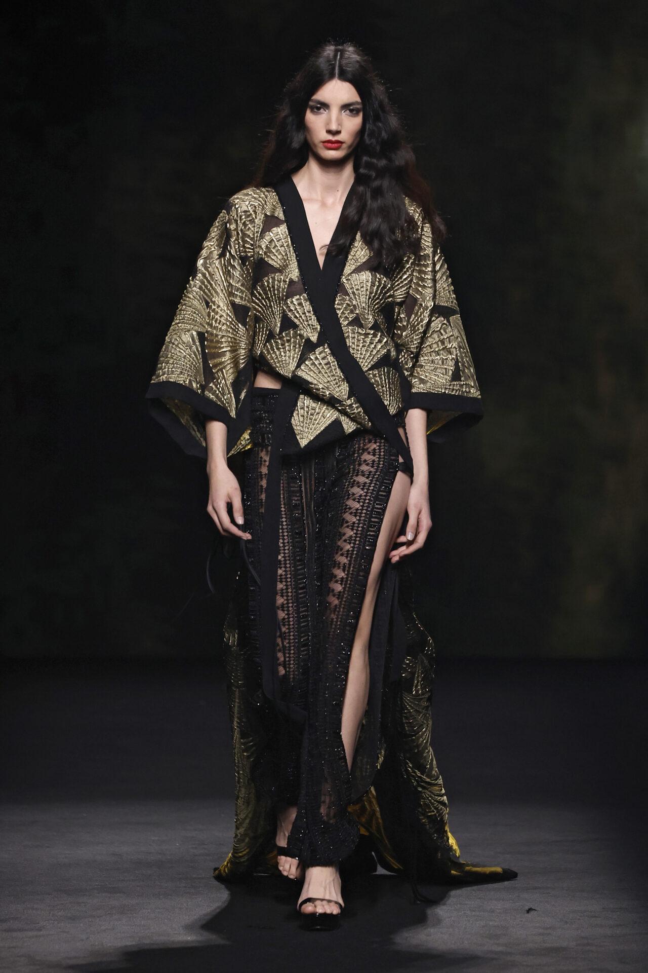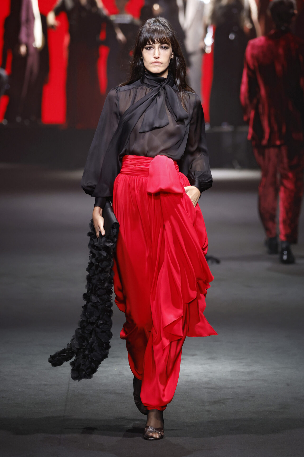 Entre los tejidos protagonistas destacan las lanas mezcladas con otros materiales como la seda y el mohair. Así, la riqueza de estas texturas contrasta con la oscuridad del propio desfile, especialmente en el uso del terciopelo con acabados como el stropicciato en rojo, negro y caqui. También hacen acto de presencia los tejidos metalizados para dar ese contraste de luz a través de las capas. Los colores predominantes, empezando y acabando en el negro más rotundo, oscilan entre el rojo burdeos o el caldero, rotos por algún que otro tono luminoso.