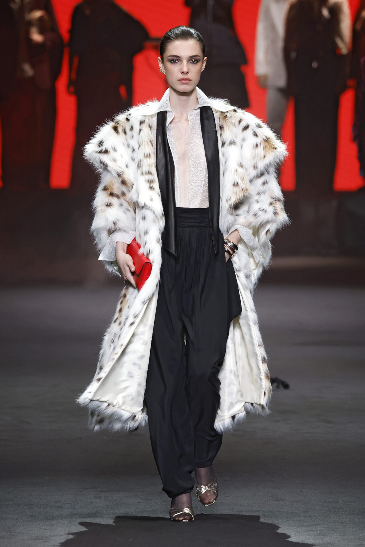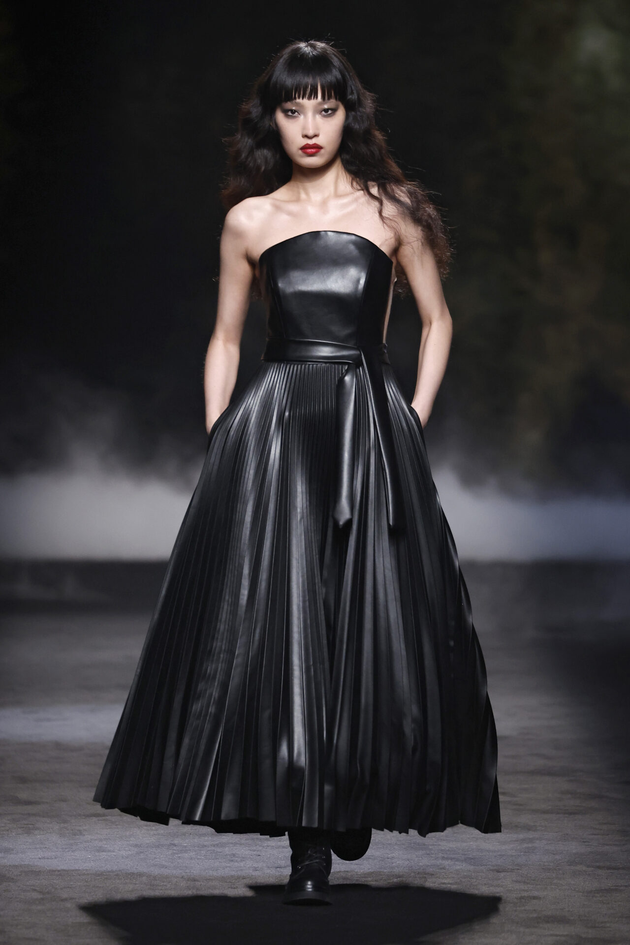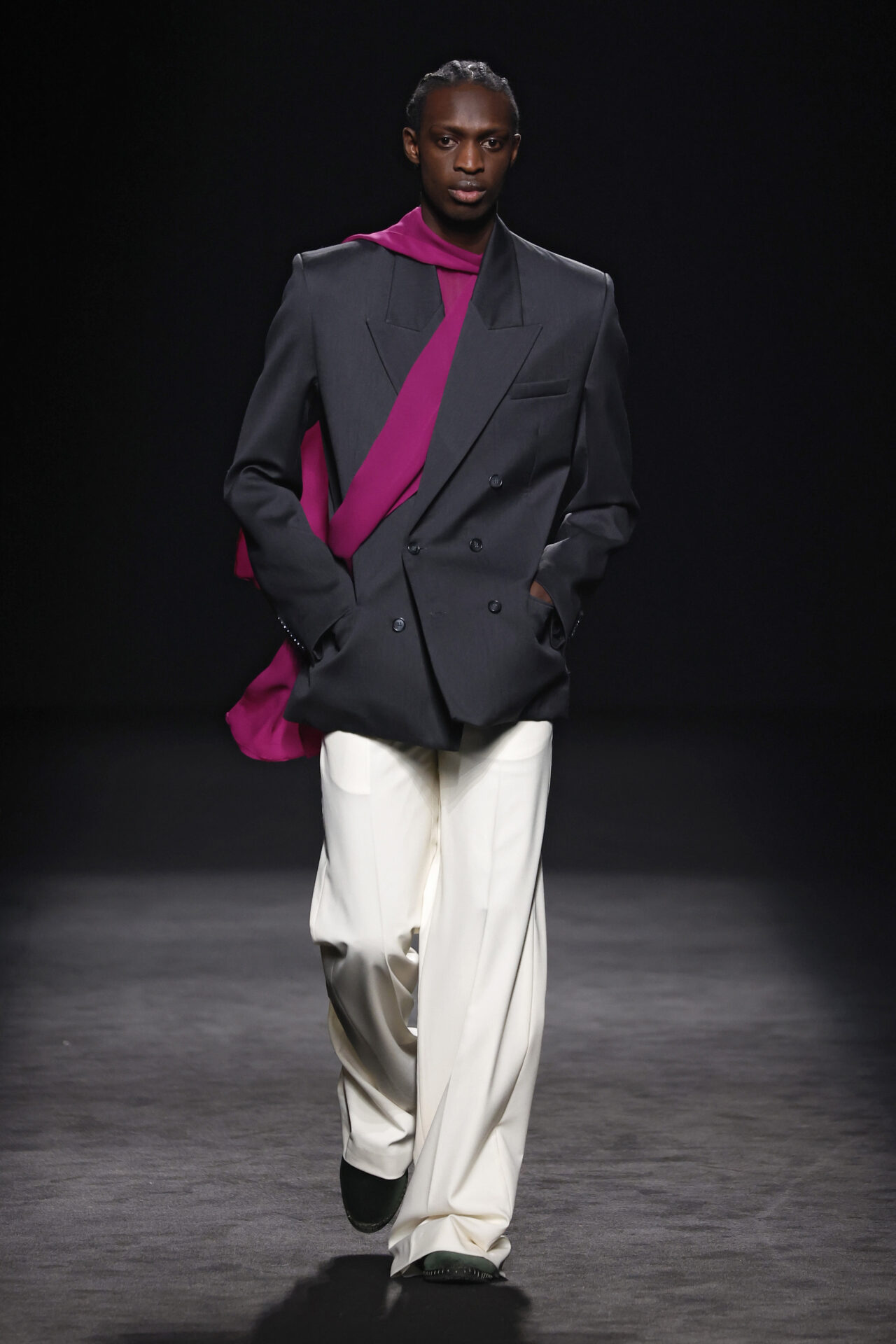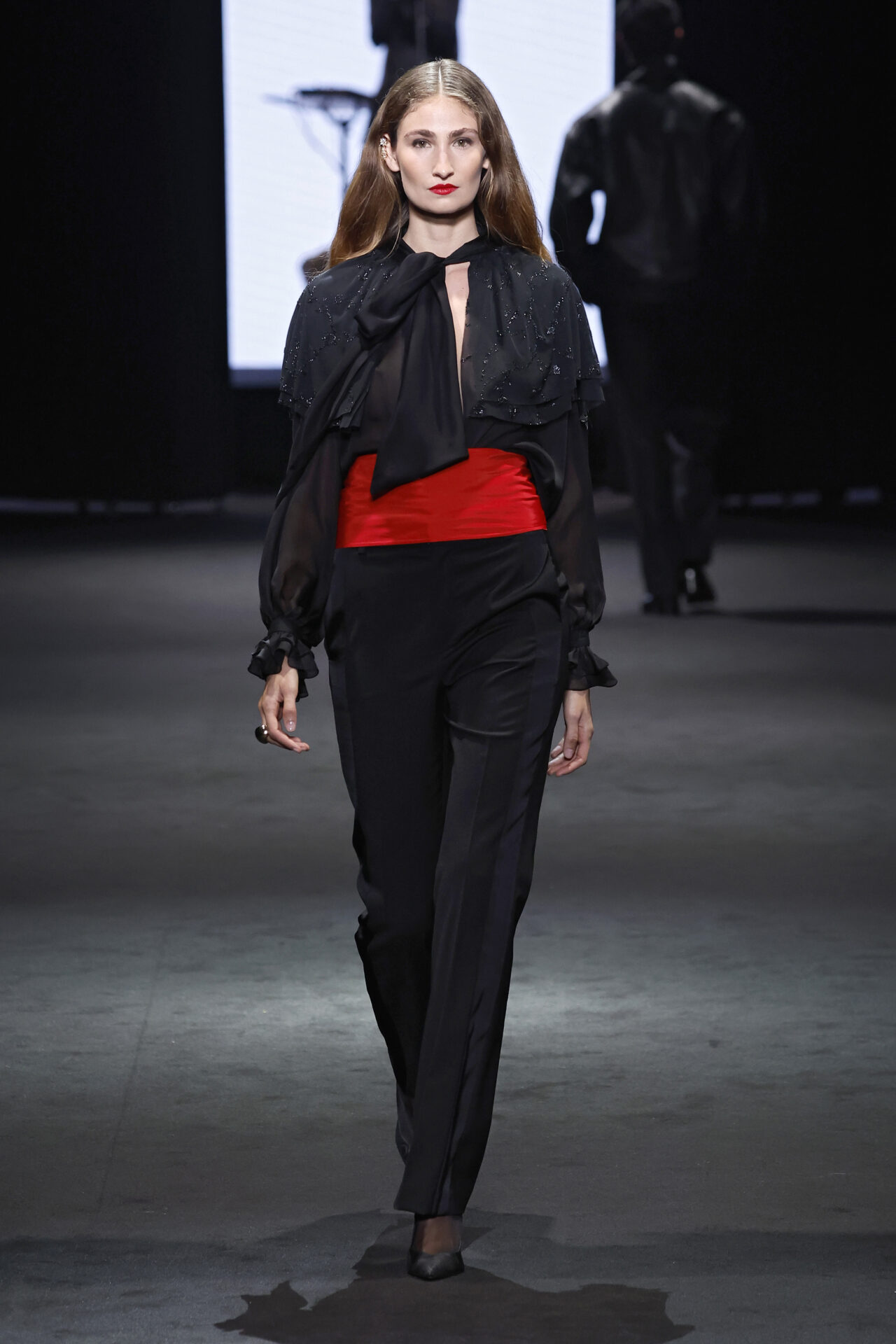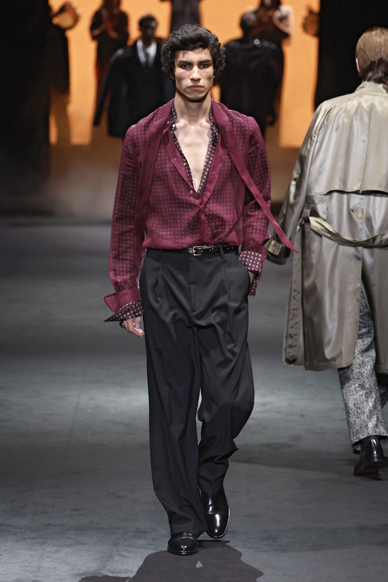 Entre los tejidos protagonistas destacan las lanas mezcladas con otros materiales como la seda y el mohair. Así, la riqueza de estas texturas contrasta con la oscuridad del propio desfile, especialmente en el uso del terciopelo con acabados como el stropicciato en rojo, negro y caqui. También hacen acto de presencia los tejidos metalizados para dar ese contraste de luz a través de las capas. Los colores predominantes, empezando y acabando en el negro más rotundo, oscilan entre el rojo burdeos o el caldero, rotos por algún que otro tono luminoso.