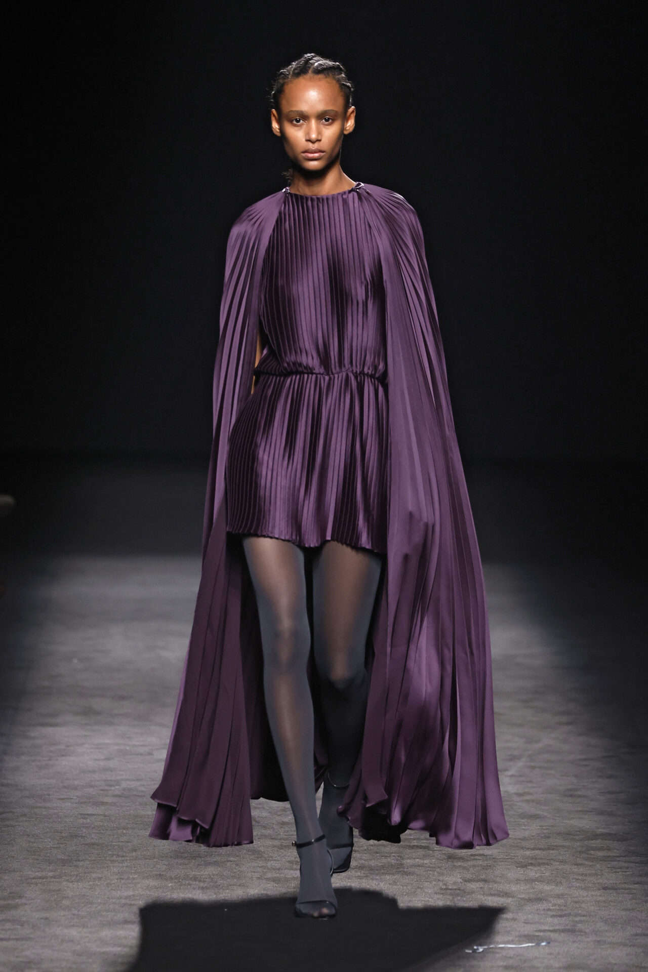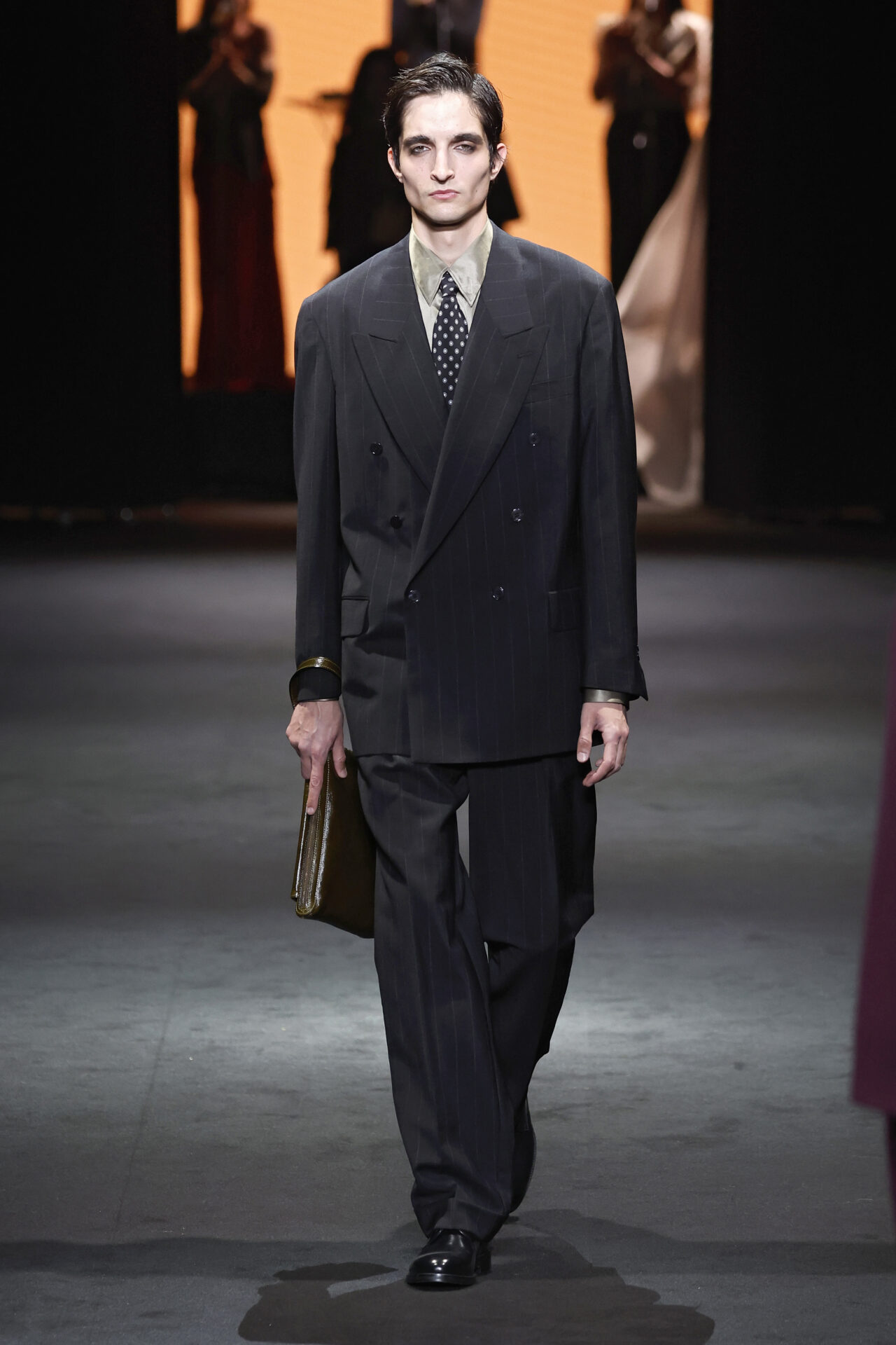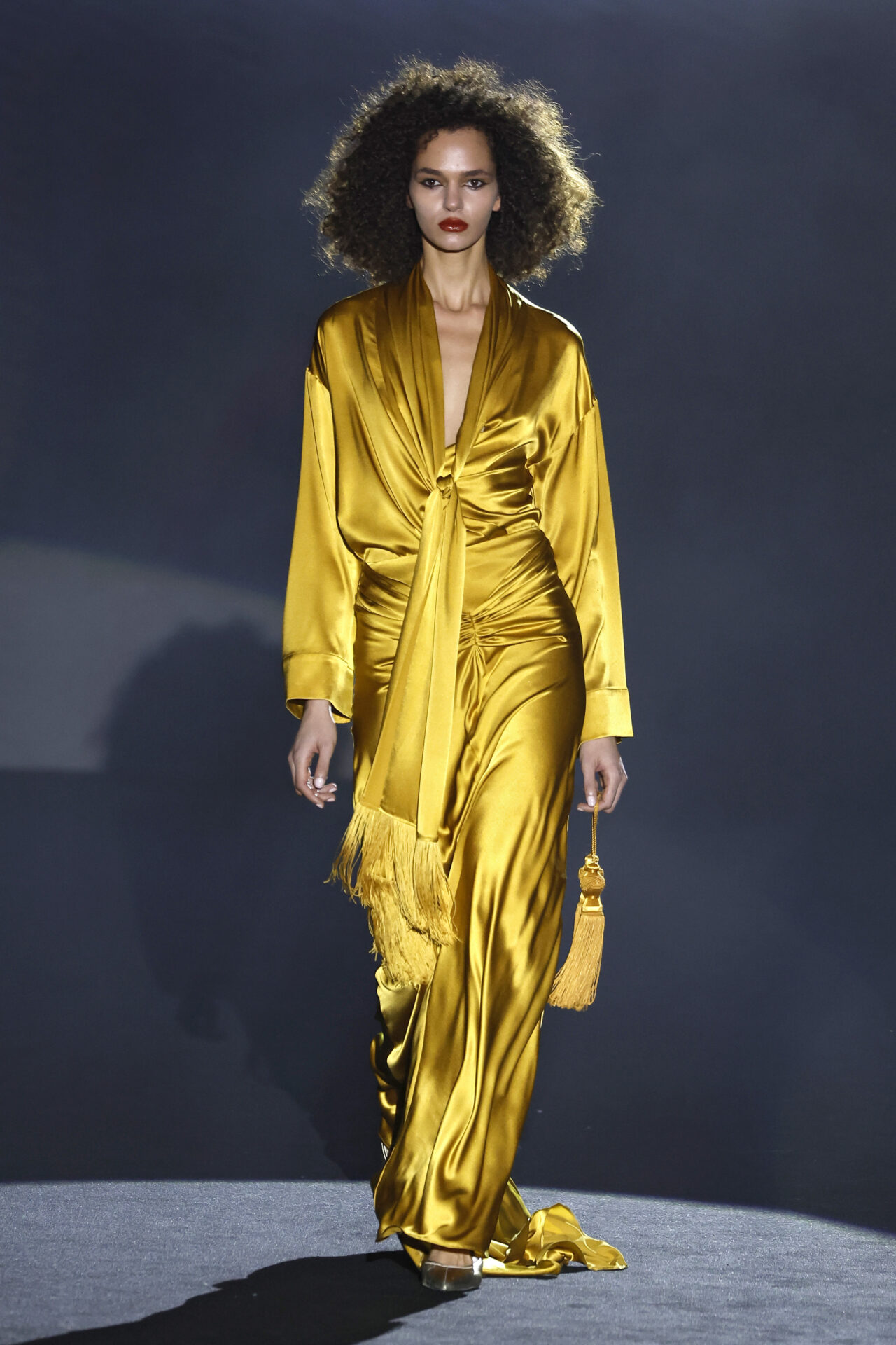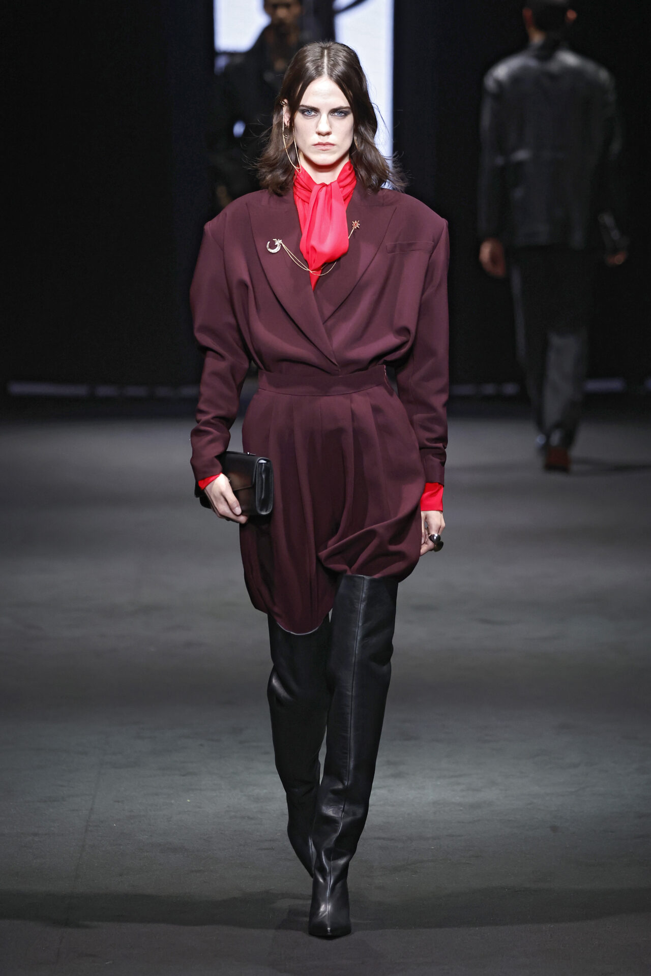 Entre los tejidos protagonistas destacan las lanas mezcladas con otros materiales como la seda y el mohair. Así, la riqueza de estas texturas contrasta con la oscuridad del propio desfile, especialmente en el uso del terciopelo con acabados como el stropicciato en rojo, negro y caqui. También hacen acto de presencia los tejidos metalizados para dar ese contraste de luz a través de las capas. Los colores predominantes, empezando y acabando en el negro más rotundo, oscilan entre el rojo burdeos o el caldero, rotos por algún que otro tono luminoso.