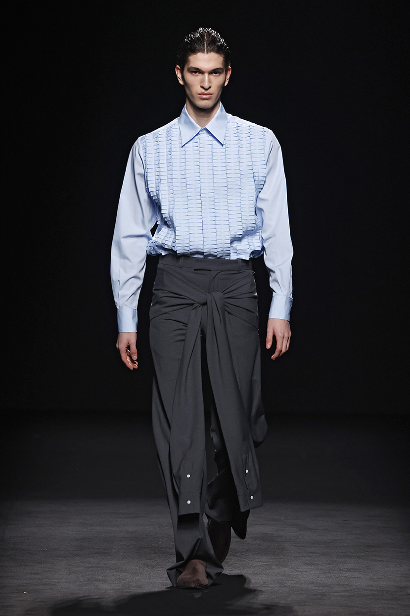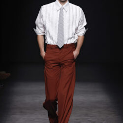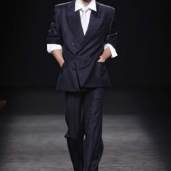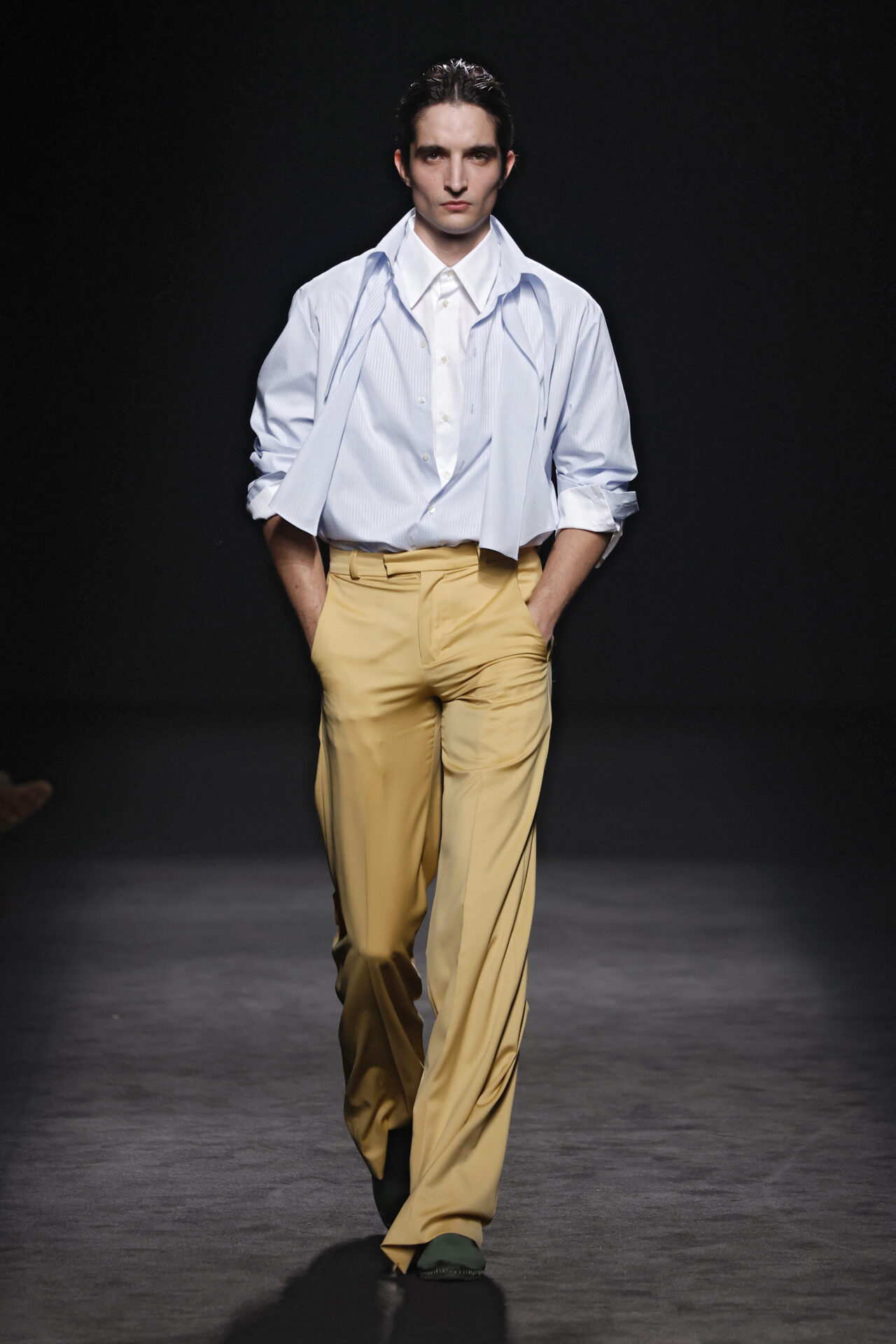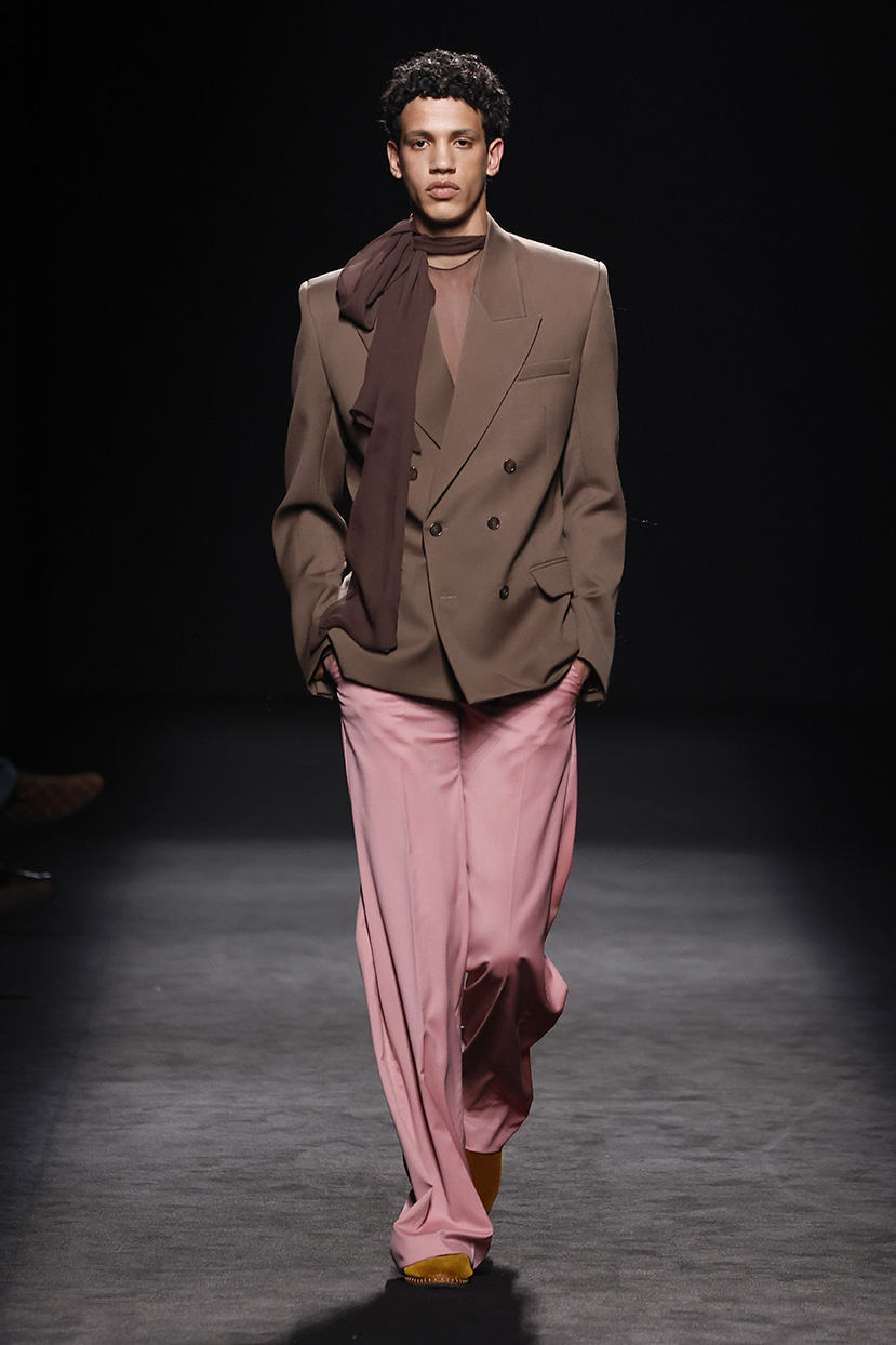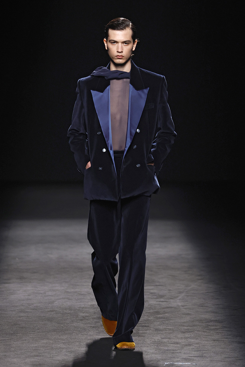 El contraste se aplica en toda la colección, jugando con el trampantojo con camisetas que sustituyen el algodón por lana transparente o el intercambio de cuellos y corbatas (de rayas y lunares) para jugar con el efecto de las falsas apariencias. En el calzado, las botas Chelsea o los tacones cubanos son clave, aludiendo al estilo personal del modisto Yves Saint Laurent en los años 70 o al vestuario escénico de artistas flamencos como Camarón de la Isla o Antonio Gades.