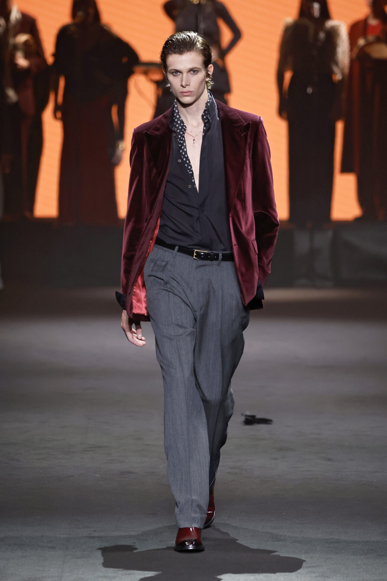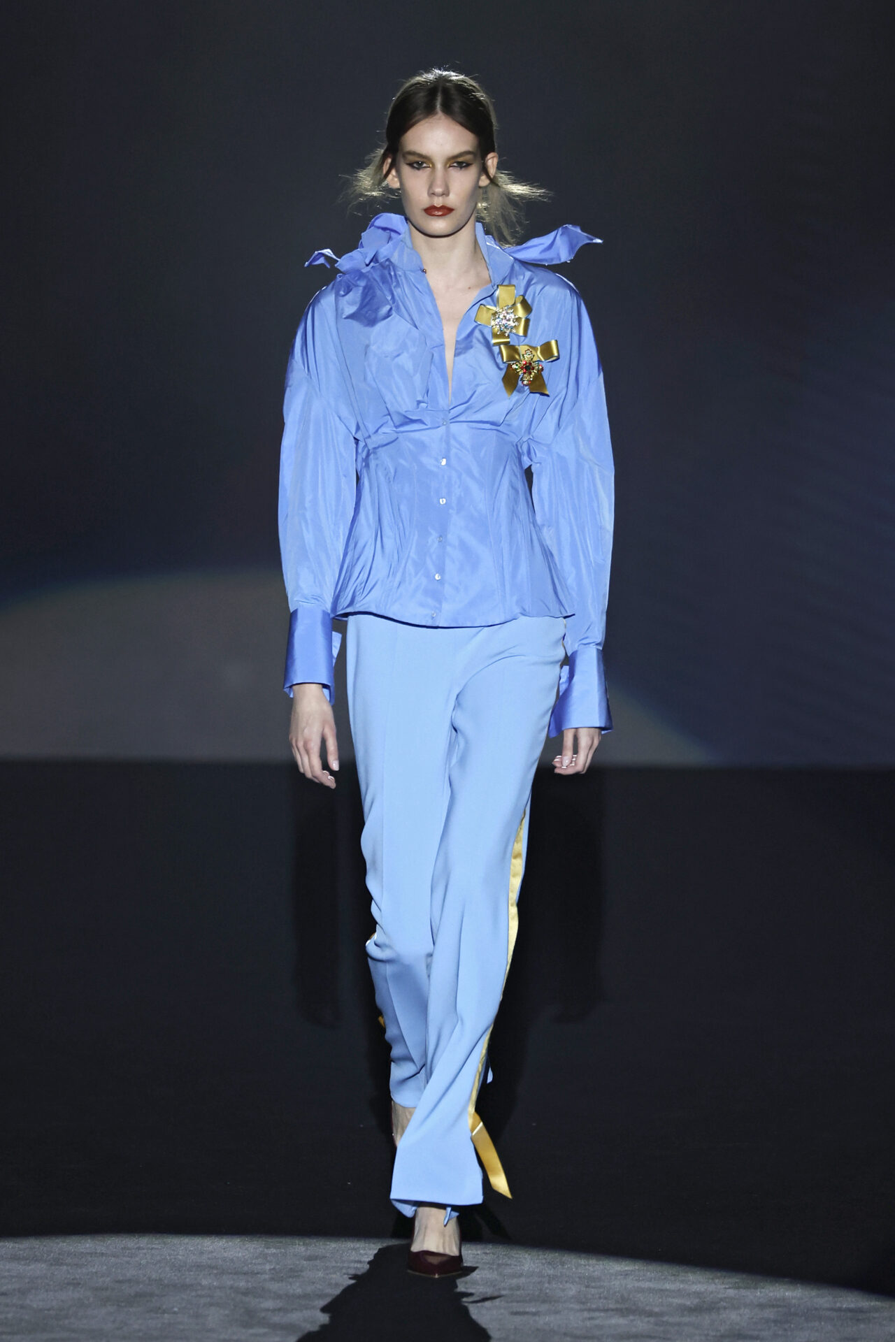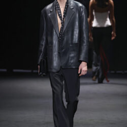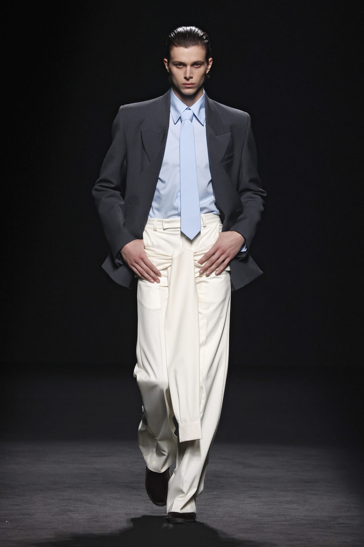 El contraste se aplica en toda la colección, jugando con el trampantojo con camisetas que sustituyen el algodón por lana transparente o el intercambio de cuellos y corbatas (de rayas y lunares) para jugar con el efecto de las falsas apariencias. En el calzado, las botas Chelsea o los tacones cubanos son clave, aludiendo al estilo personal del modisto Yves Saint Laurent en los años 70 o al vestuario escénico de artistas flamencos como Camarón de la Isla o Antonio Gades.