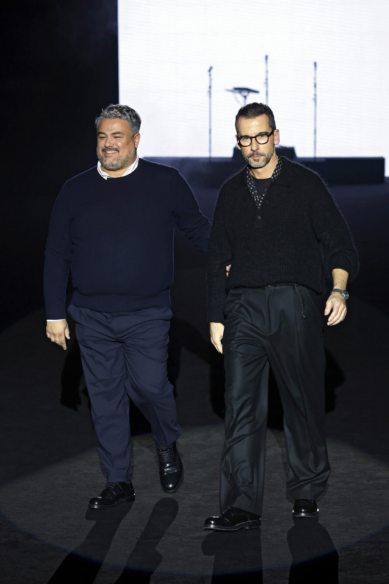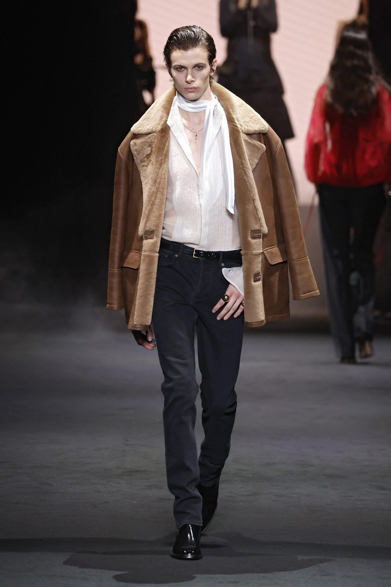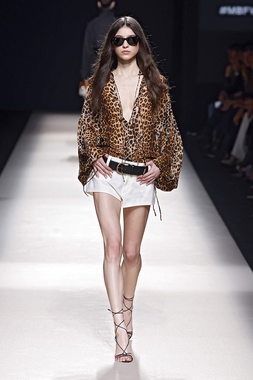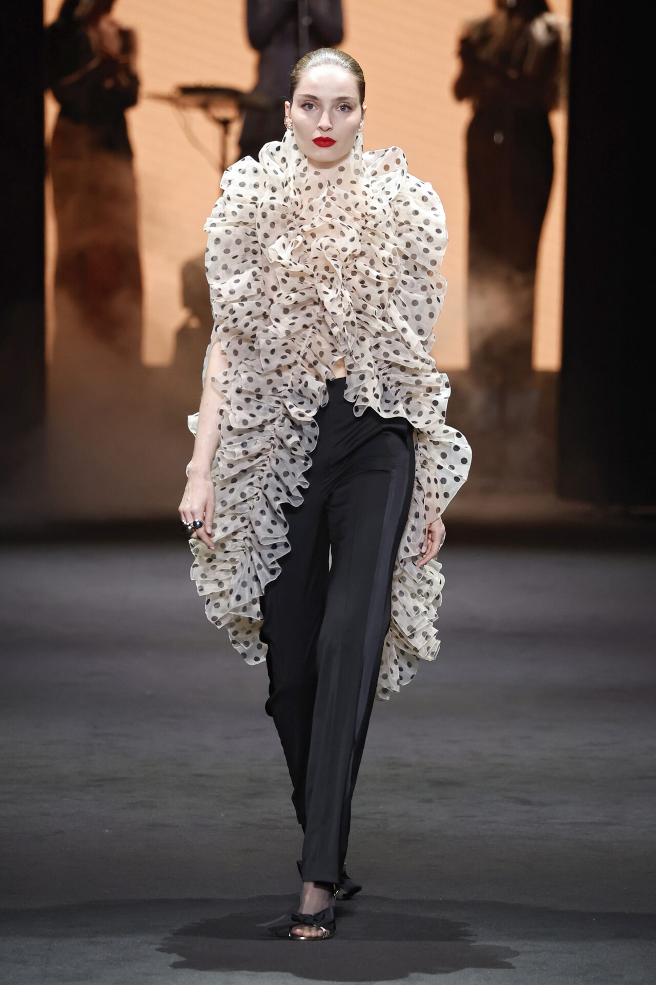 El contraste se aplica en toda la colección, jugando con el trampantojo con camisetas que sustituyen el algodón por lana transparente o el intercambio de cuellos y corbatas (de rayas y lunares) para jugar con el efecto de las falsas apariencias. En el calzado, las botas Chelsea o los tacones cubanos son clave, aludiendo al estilo personal del modisto Yves Saint Laurent en los años 70 o al vestuario escénico de artistas flamencos como Camarón de la Isla o Antonio Gades.