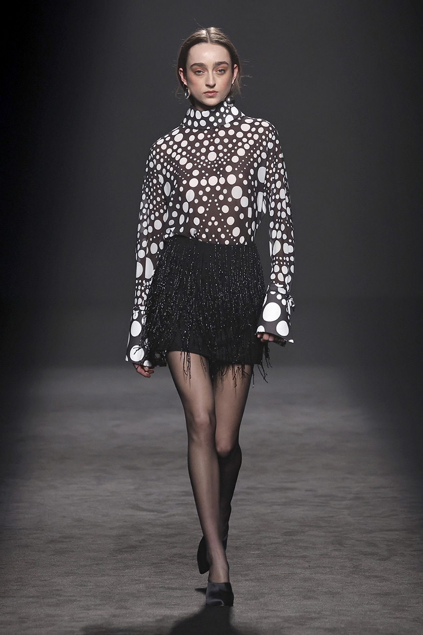 La colección “El Pellizco” ofrece una estética flamenca para una noche de éxtasis y fiesta, sin año ni lugar concreto, donde la alta sociedad se mezcla con la calle sin prejuicios y donde cada modelo emula a un personaje nocturno de esa vida nocturna clandestina, donde el negro lo cubre todo y la mañana ni siquiera se adivina