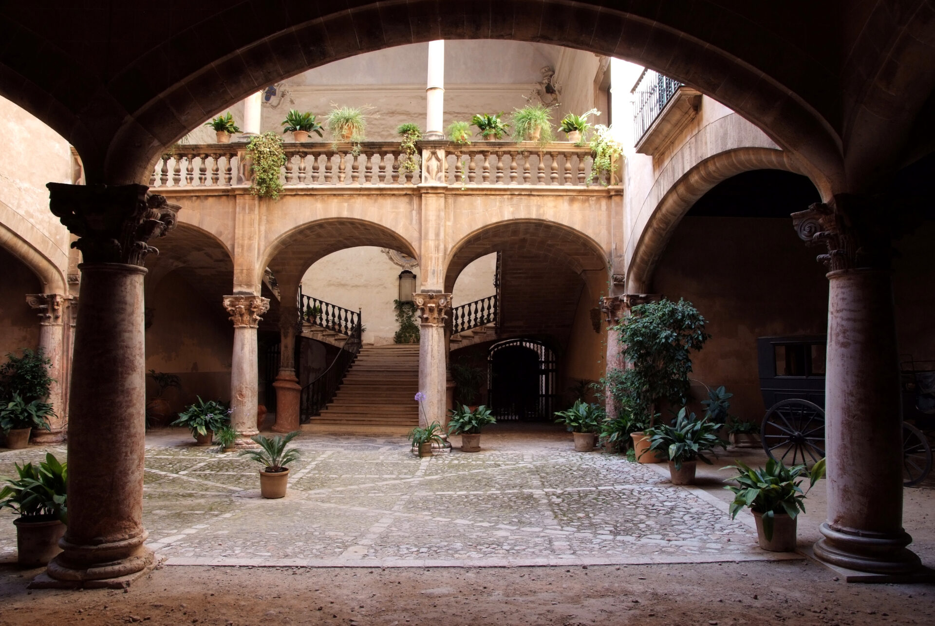 Este imponente casal se esconde tras una verja de hierro forjado en un estrecho callejón en el corazón de Palma; tras esa verja se abre un espléndido patio barroco sostenido por columnas corintias y exquisitamente decorado con azulejos tradicionales, plantas exuberantes y una fuente centenaria. Este espacio encantador es el corazón del casal y sirve como punto de partida para explorar sus tesoros ocultos.