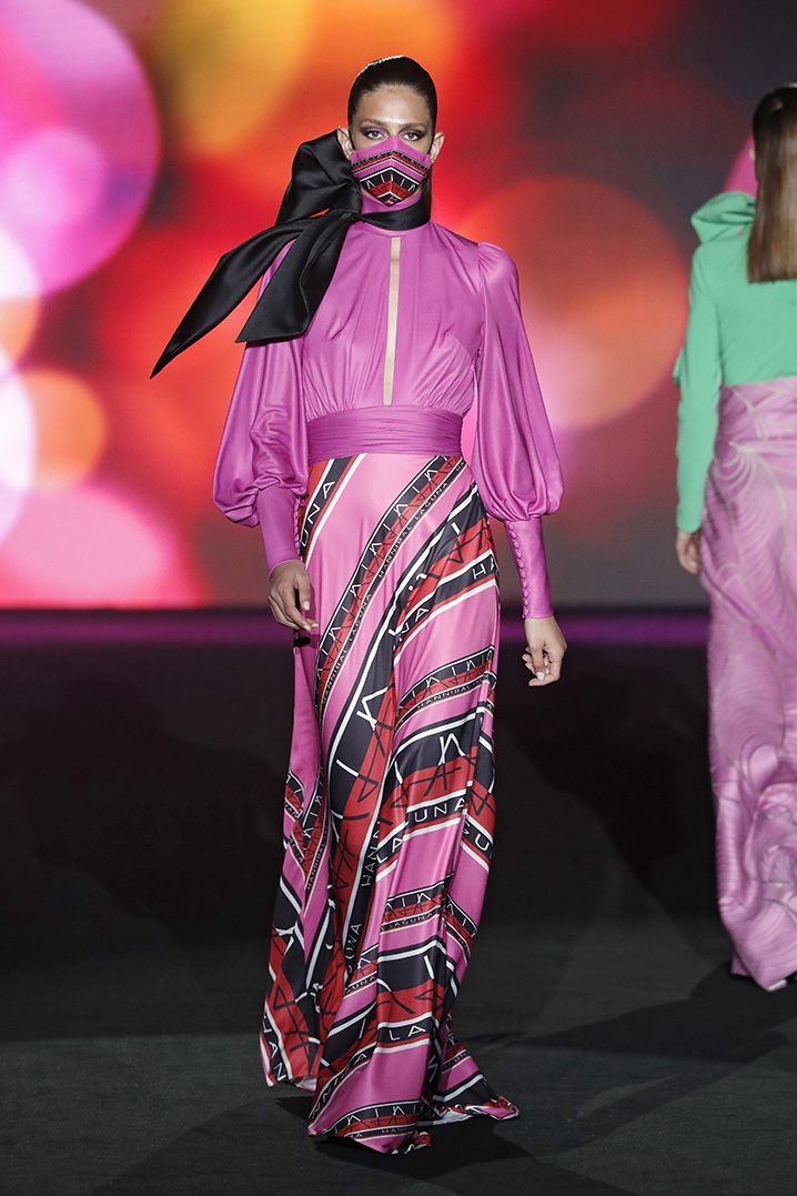 La colección hace referencia al exótico Oriente, a sus fragancias, a las flores que crecen en sus majestuosos jardines están presentes en esta colección en que las texturas traslúcidas se alían con estampados maximalistas, para provocar una simbiosis con las mascarillas que ya forman parte de nuestra vida. Vestidos con cuellos cisne, mangas bulbo, faldas cortadas al bies y grandes lazadas que acentúan la feminidad. En colores naranjas intensos, amarillos neon, verdes vegetales y los rosas florales.