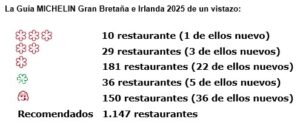 La edición de 2025 se amplía con tres nuevos restaurantes con dos Estrellas MICHELIN y 22 restaurantes con una Estrella MICHELIN. 36 establecimientos se unen a la categoría Bib Gourmand gracias a una oferta culinaria de muy buena calidad combinada con una gama de precios contenidos. Por último, 5 nuevos restaurantes han sido galardonados con la Estrella Verde MICHELIN por su notable compromiso con una gastronomía más responsable