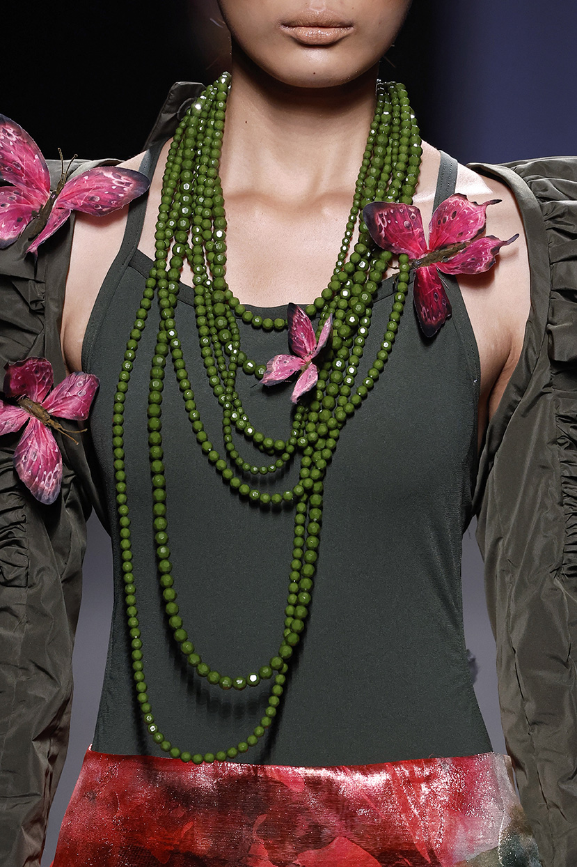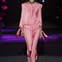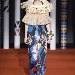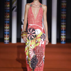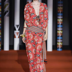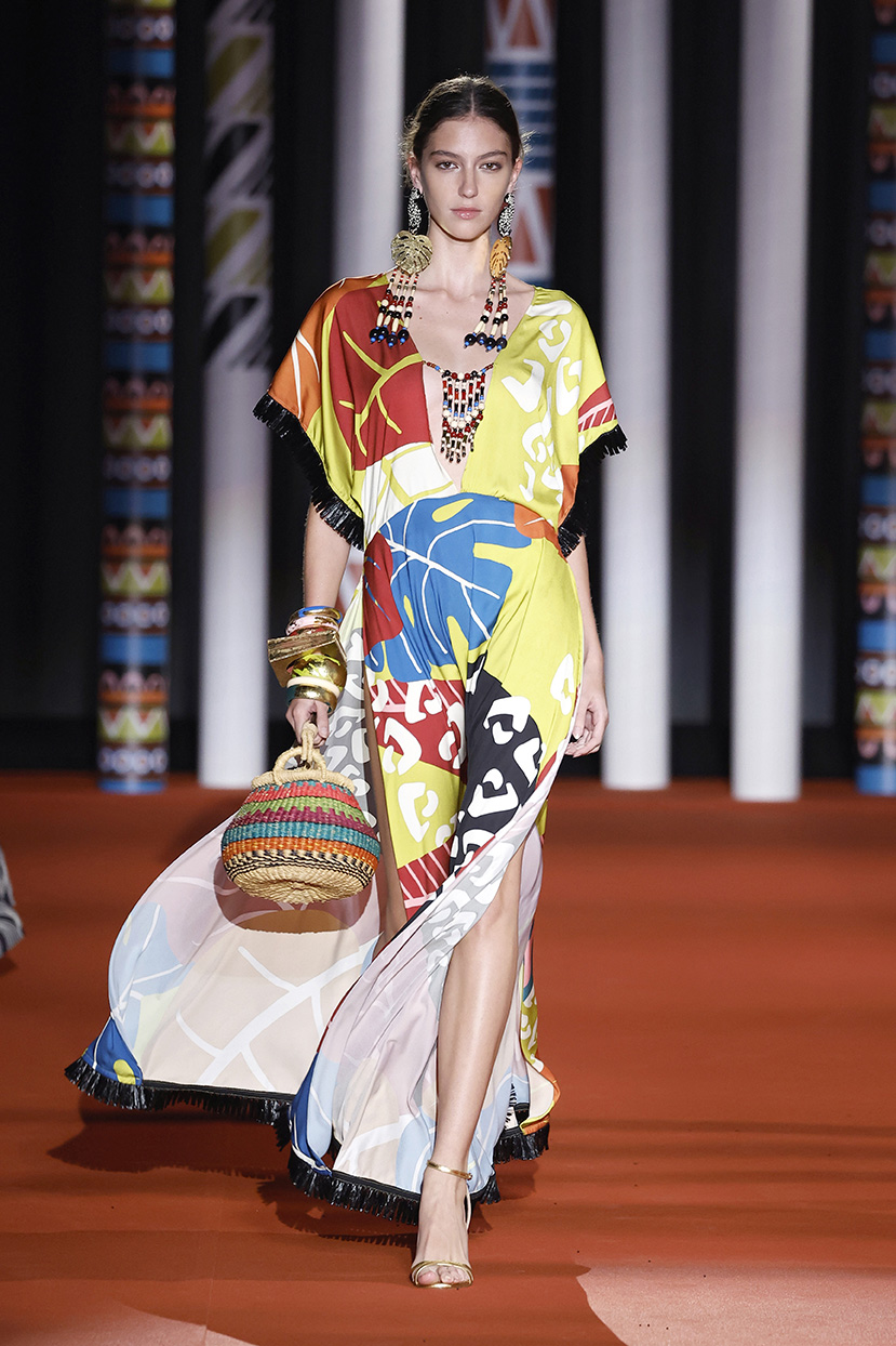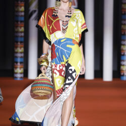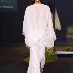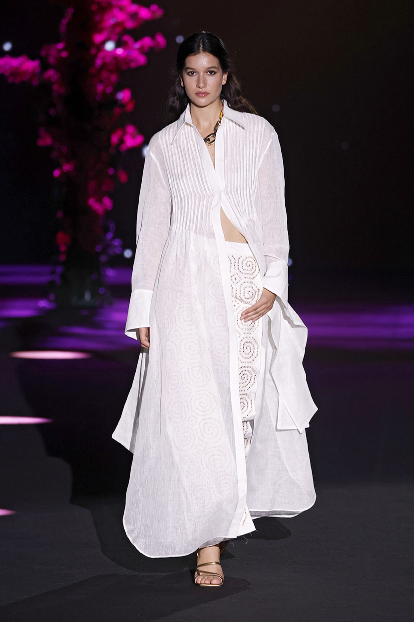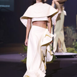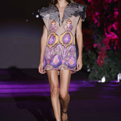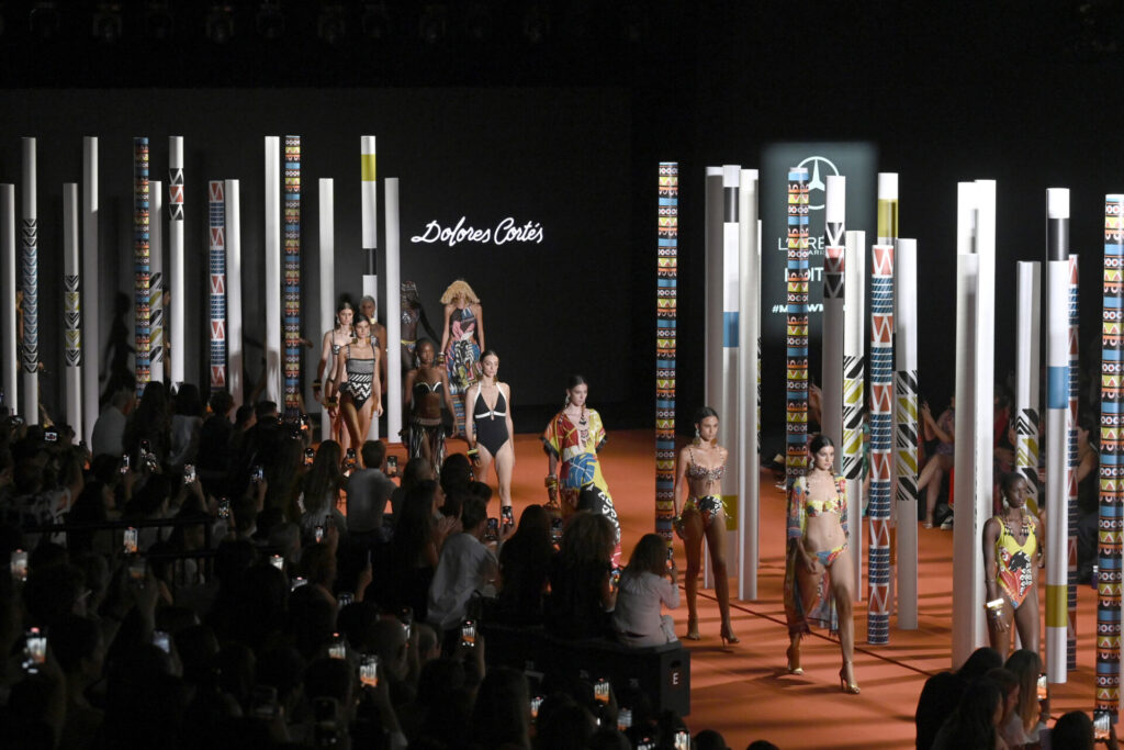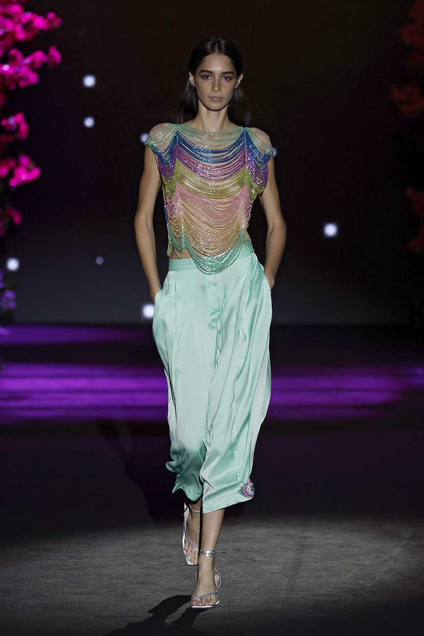 En la pasarela se aparecieron contrastes de texturas y técnicas: tejidos ligeros como el lino y el popelín dialogaron con bordados, pedrerías, flecos y otros materiales de diversas texturas y colores. La paleta osciló entre el turquesas, fucsias y verdes, con destellos dorados y plateados.