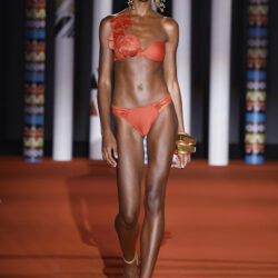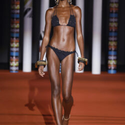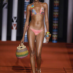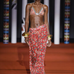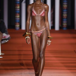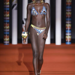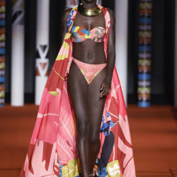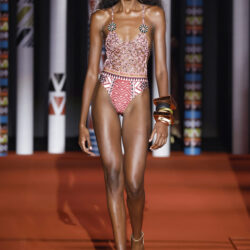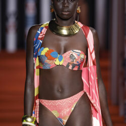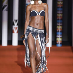 Las piezas alcanzan un nuevo nivel de sofisticación con la incorporación de acabados de lúrex, que les confieren una sensación luminosa y sensual. Con cada movimiento el tejido capta la luz del sol sobre el agua, que le aportan un toque de glamour sin comprometer la esencia artesanal de la colección. En cuanto a la paleta de colores, se caracteriza por pigmentos terrosos y tonos neutros. Predominan los tonos terracota con tríadas de marfil, negro y verde hoja, que contrastan con tonos saturados de colores vibrantes, principalmente el azul índigo. Esta colección es más que una línea de trajes de baño es un homenaje a la creatividad, la herencia africana y el poder del diseño como medio de expresión.
