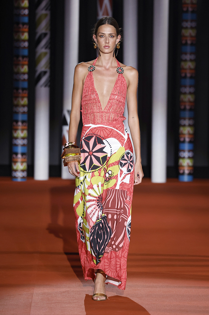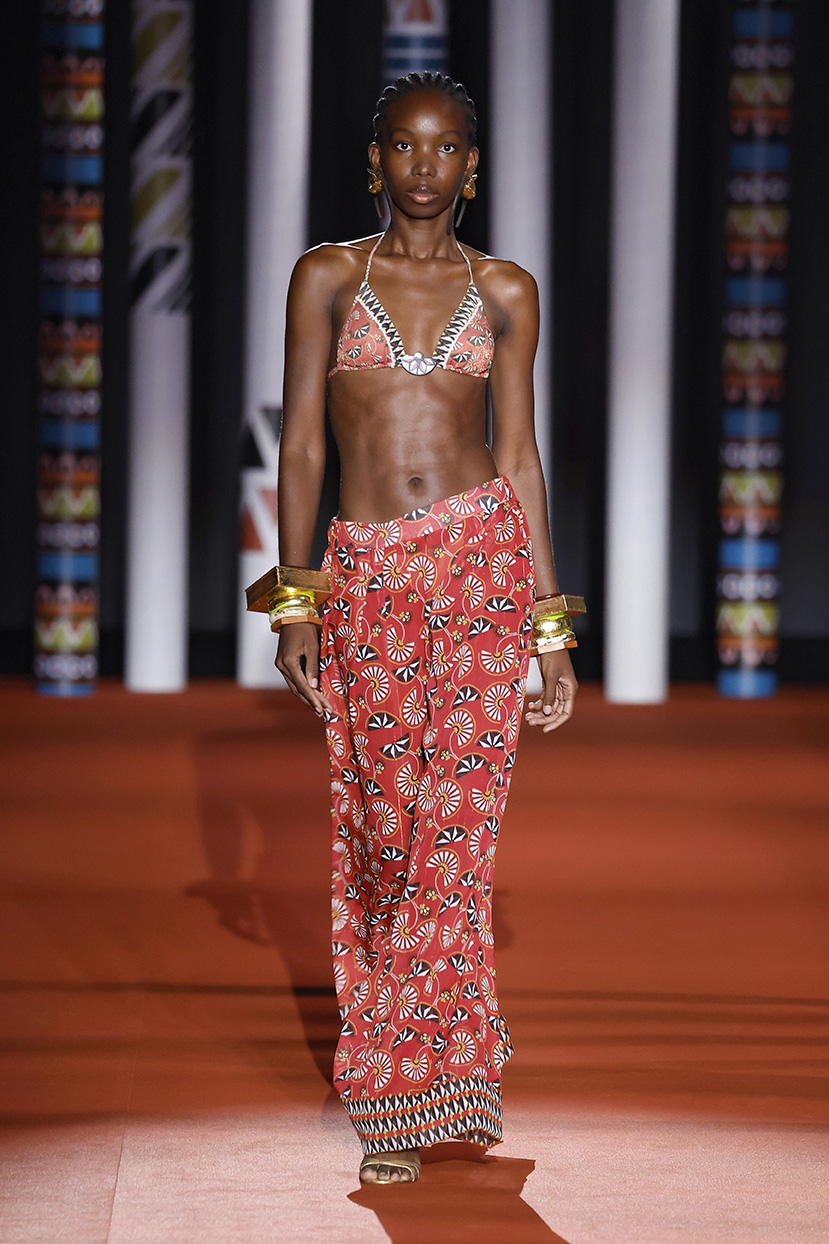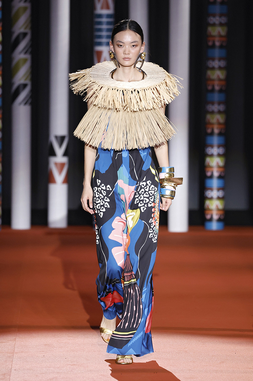 El atractivo de la colección reside en la fuerza de sus estampados que evocan los característicos patrones geométricos de las pinturas murales Ndebele que habitan en el sur de África, conocidos por su arte colorido y sus tradiciones culturales.