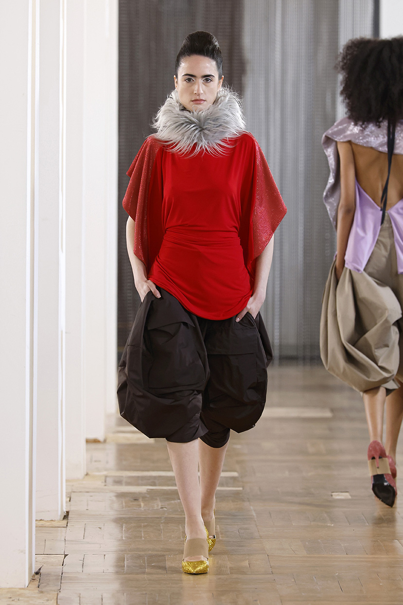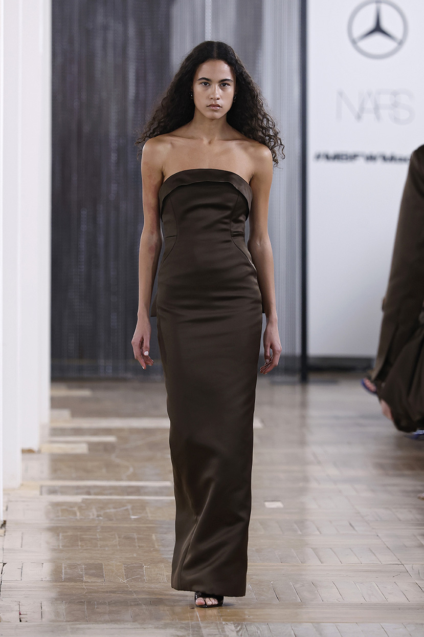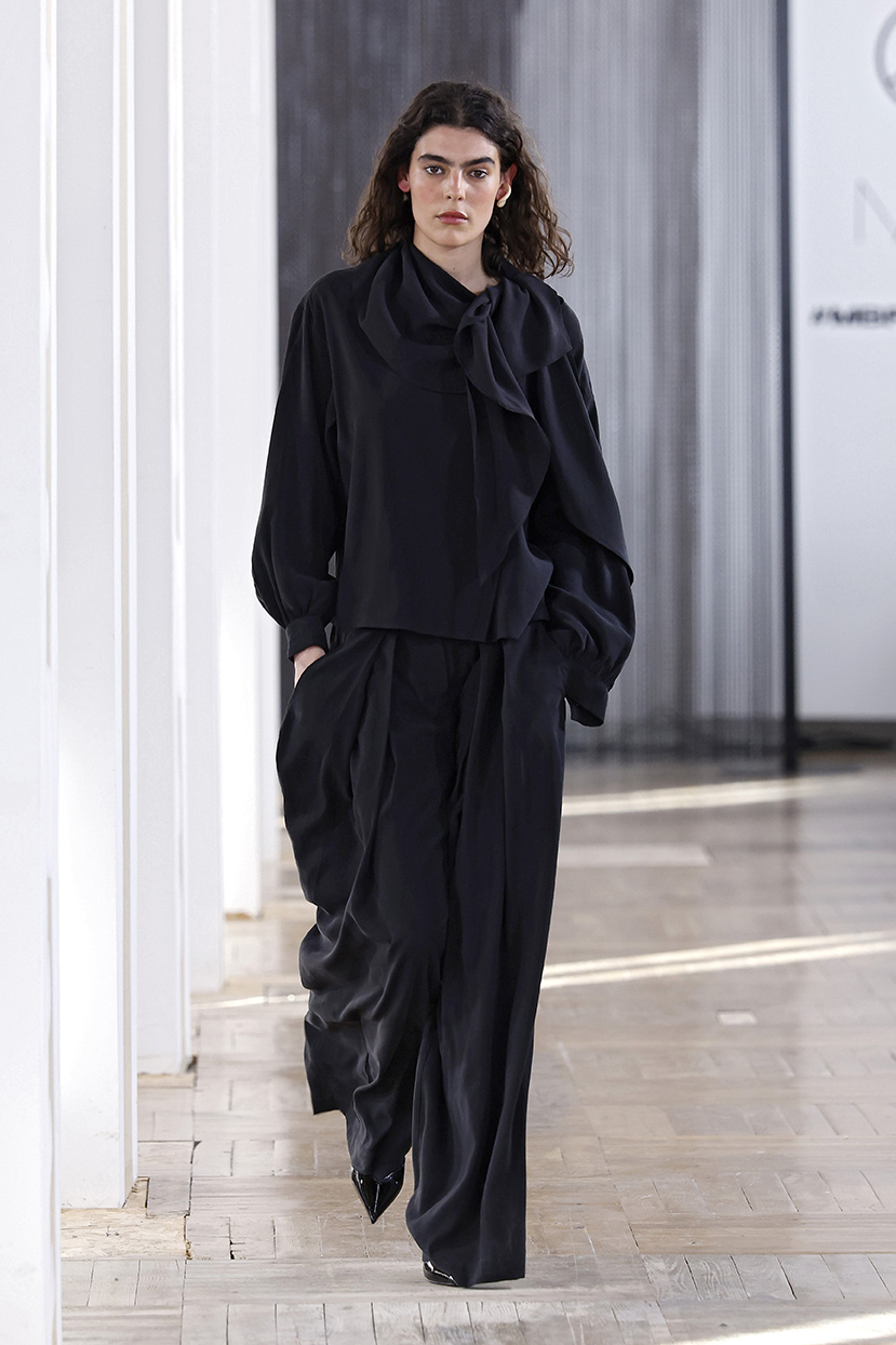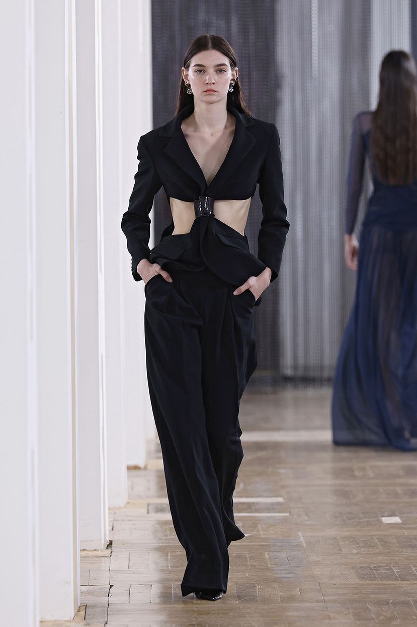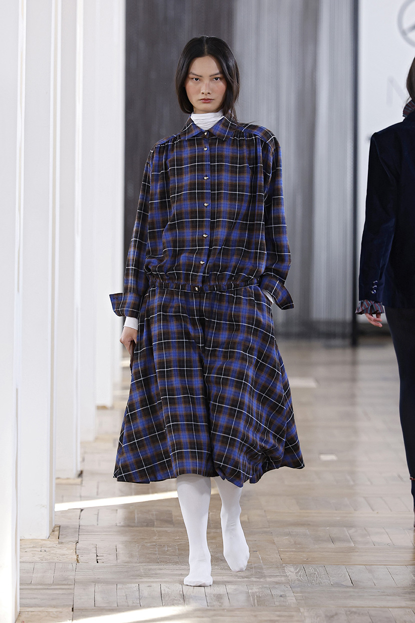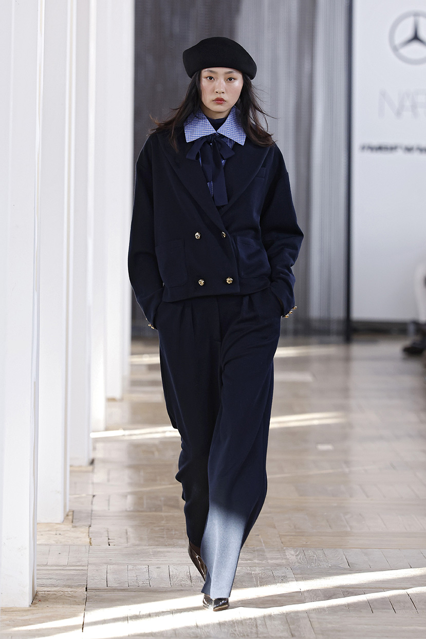 En la MBFW ha presentado una colección más madura que reafirma su identidad a través de las distintas tonalidades de azul y una paleta mucho más sobria de lo habitual: de negro, marrón, beige, burdeos, azulón, gris y toques de verde pistacho, donde dialogan la moda contemporánea y la artesanía. Inspirada en técnicas tradicionales, la propuesta da forma a siluetas encorsetadas y estructuradas, con faldas globo, frunces, cut-outs, hombros XL y tiro bajo, en un contraste entre lo formal y lo tendencia que consolida el lenguaje creativo de la marca.