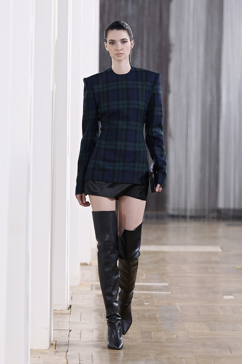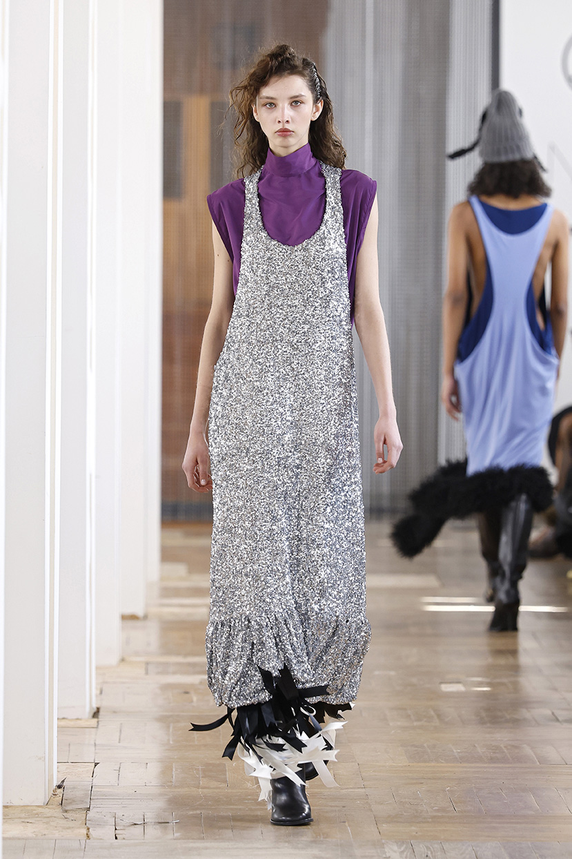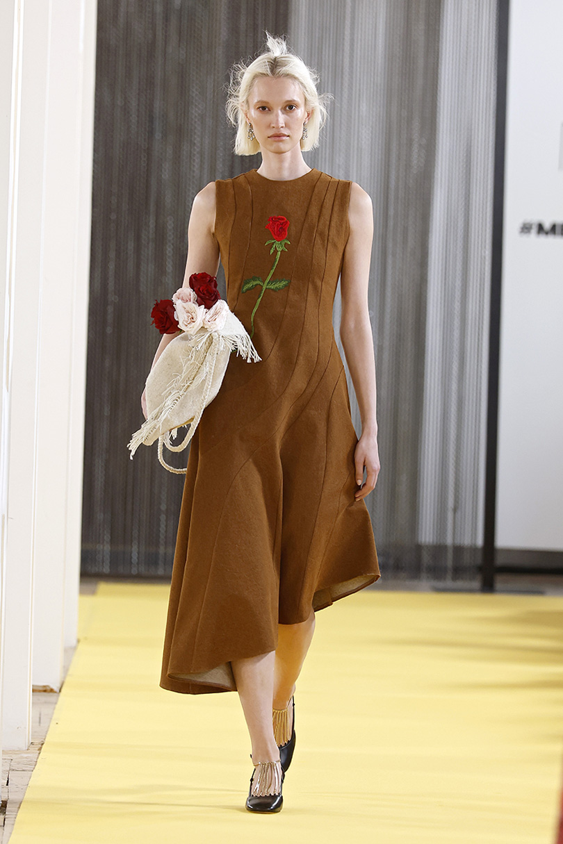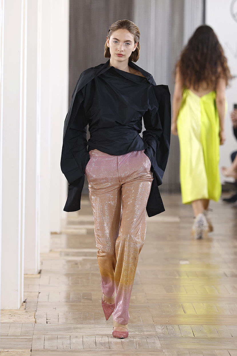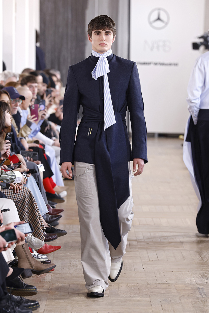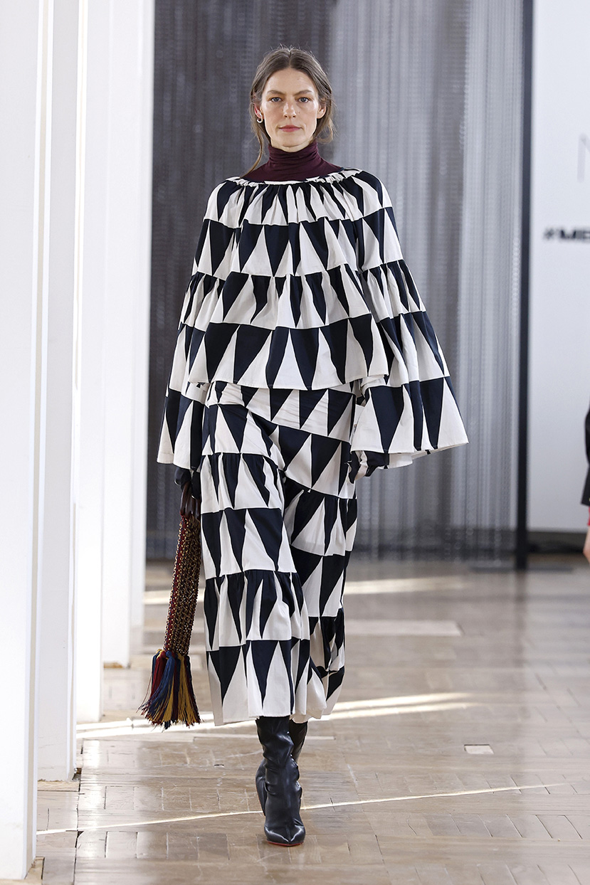 En la MBFW ha presentado una colección más madura que reafirma su identidad a través de las distintas tonalidades de azul y una paleta mucho más sobria de lo habitual: de negro, marrón, beige, burdeos, azulón, gris y toques de verde pistacho, donde dialogan la moda contemporánea y la artesanía. Inspirada en técnicas tradicionales, la propuesta da forma a siluetas encorsetadas y estructuradas, con faldas globo, frunces, cut-outs, hombros XL y tiro bajo, en un contraste entre lo formal y lo tendencia que consolida el lenguaje creativo de la marca.