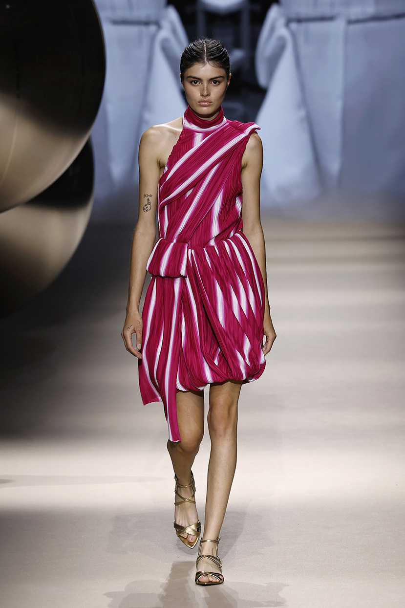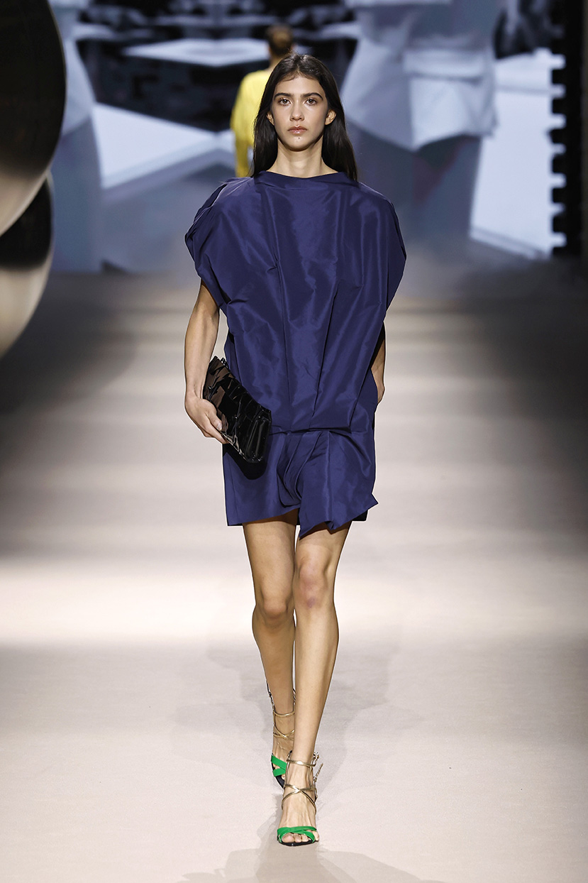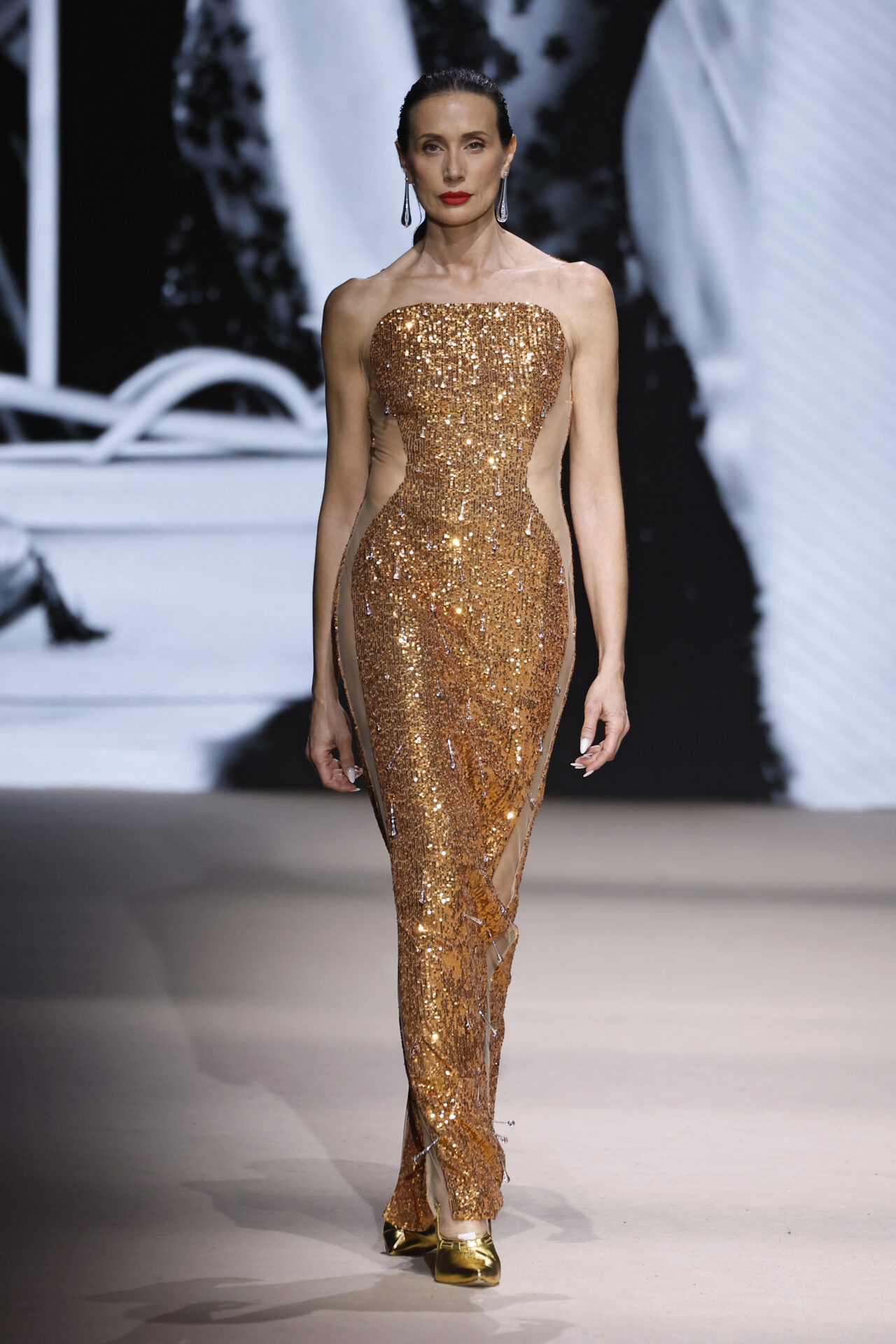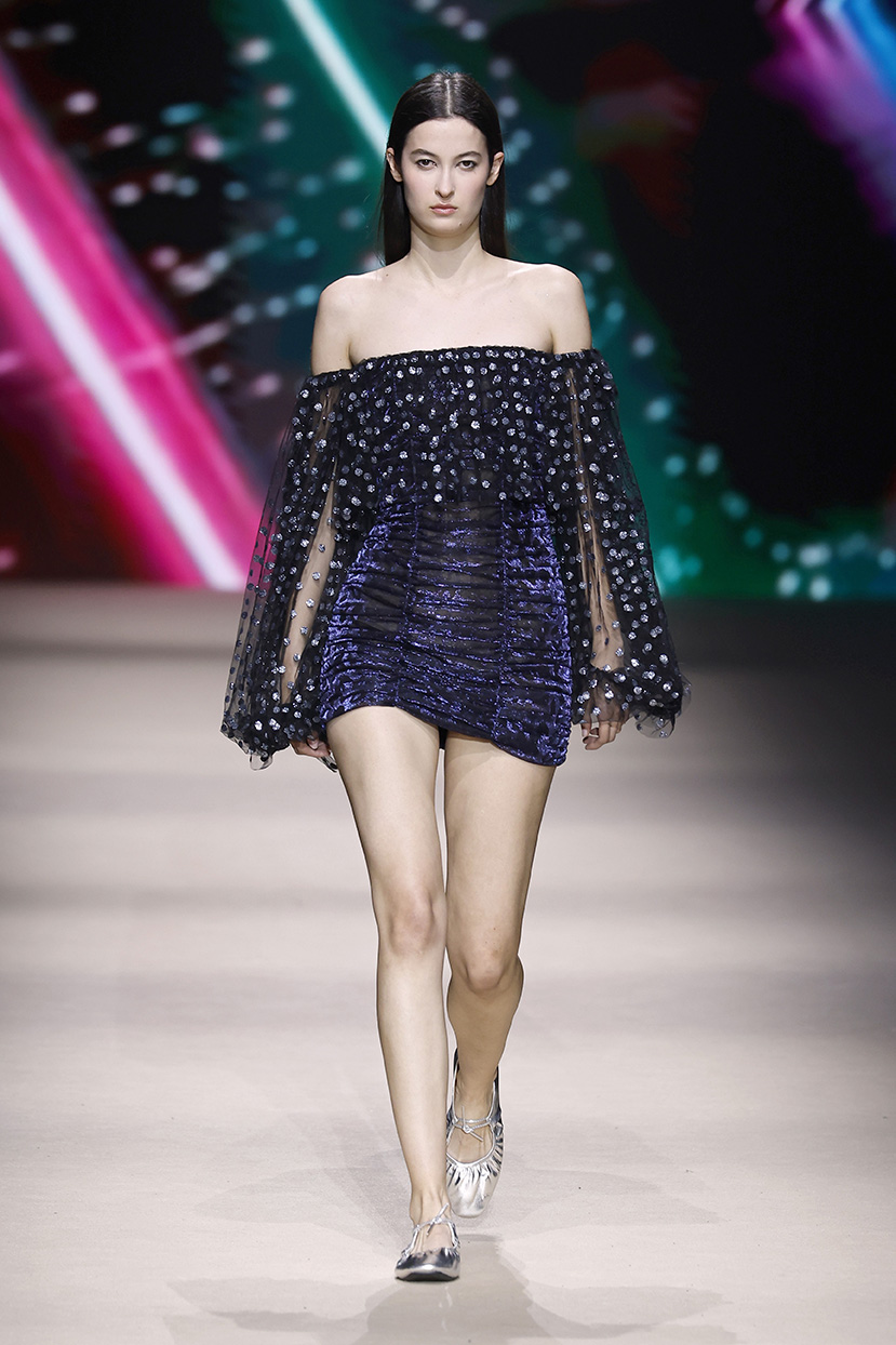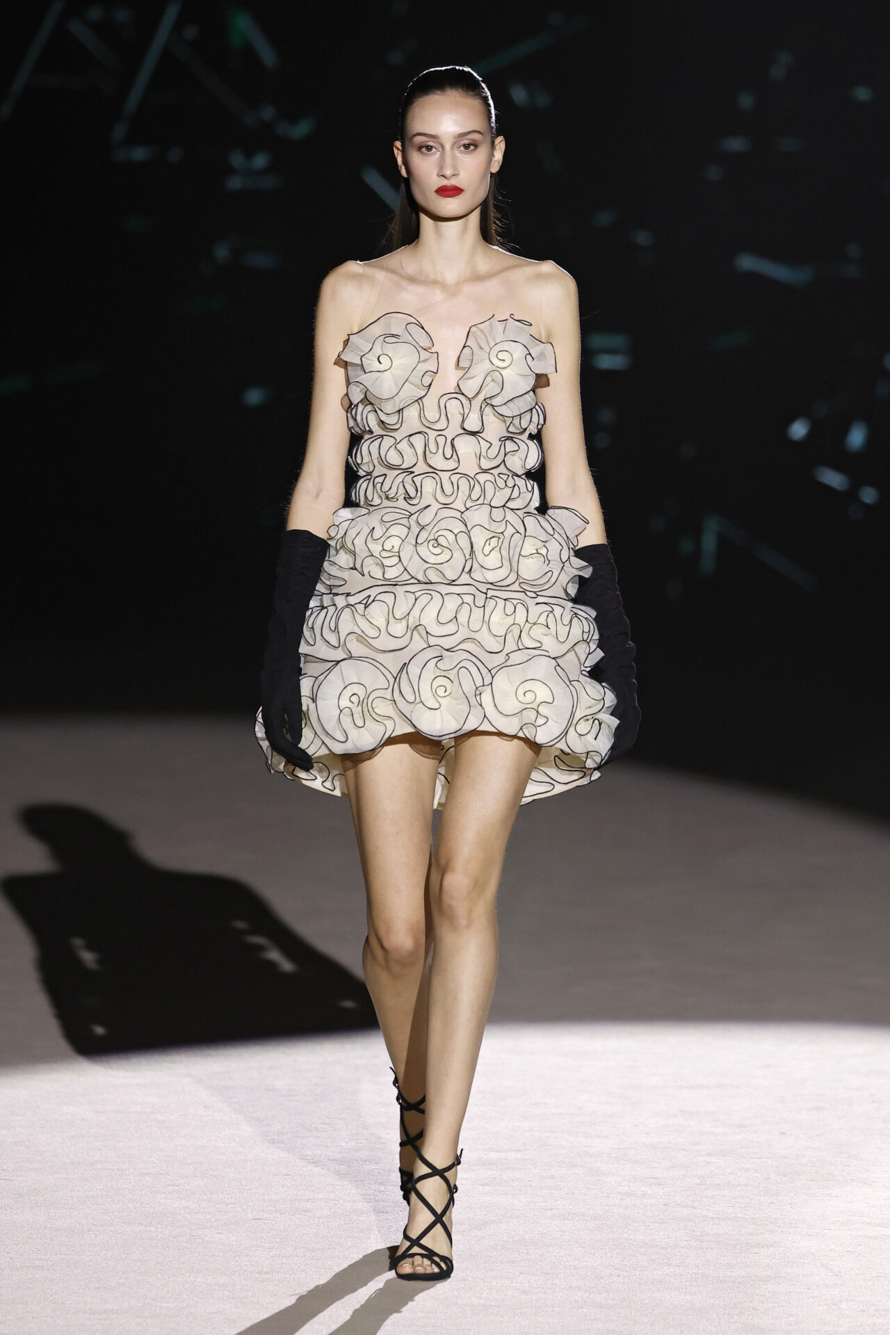 Entre los looks destacados, se presentan los minivestidos con tules plumeti y detalles iridiscentes que evocan un firmamento en movimiento, con mangas abullonadas y drapeados fluidos que construyen una silueta poderosa y etérea.