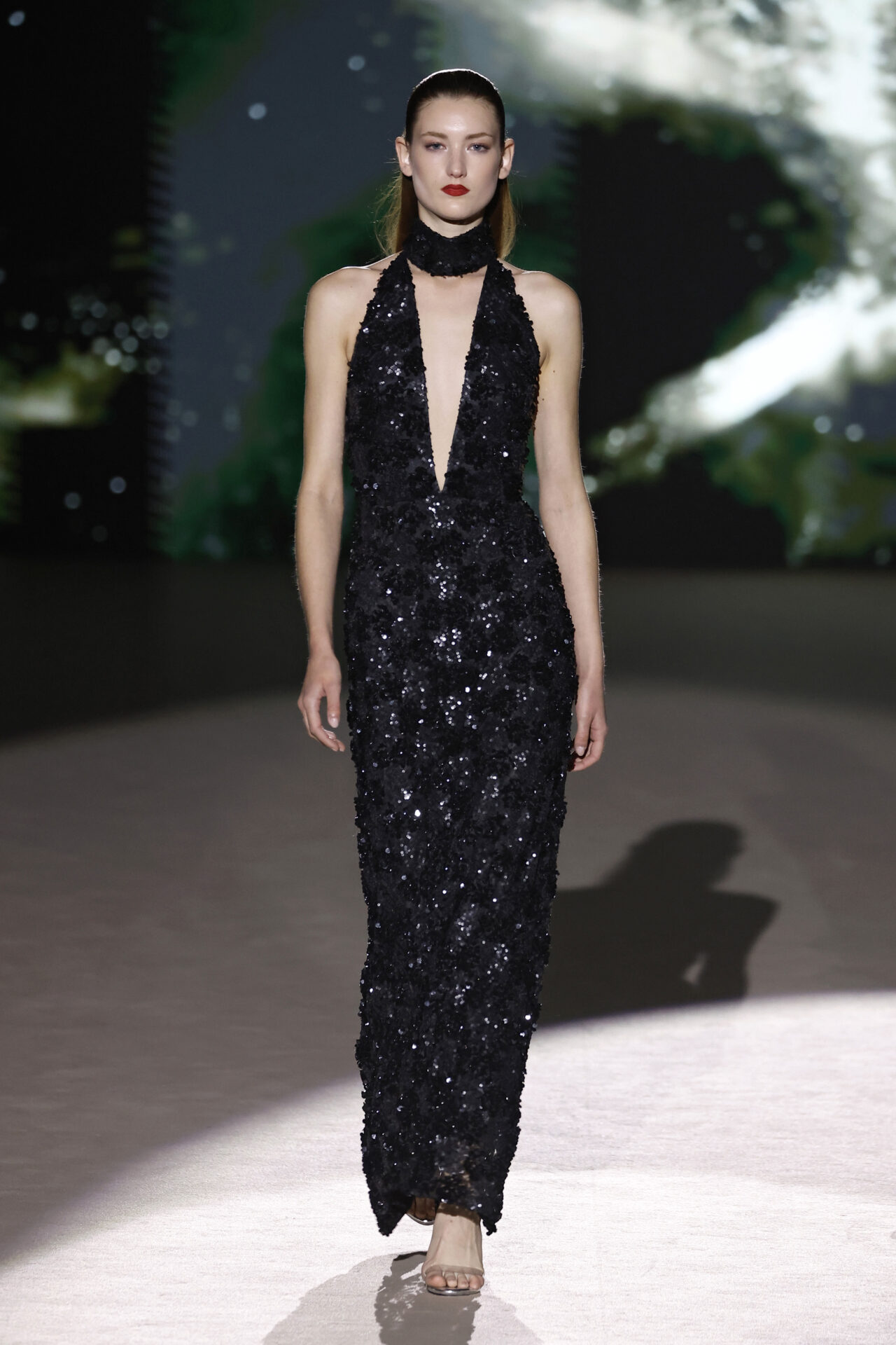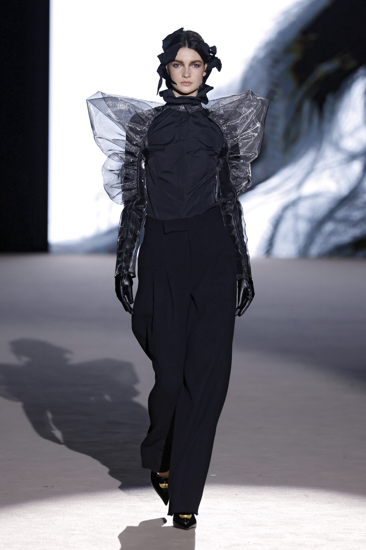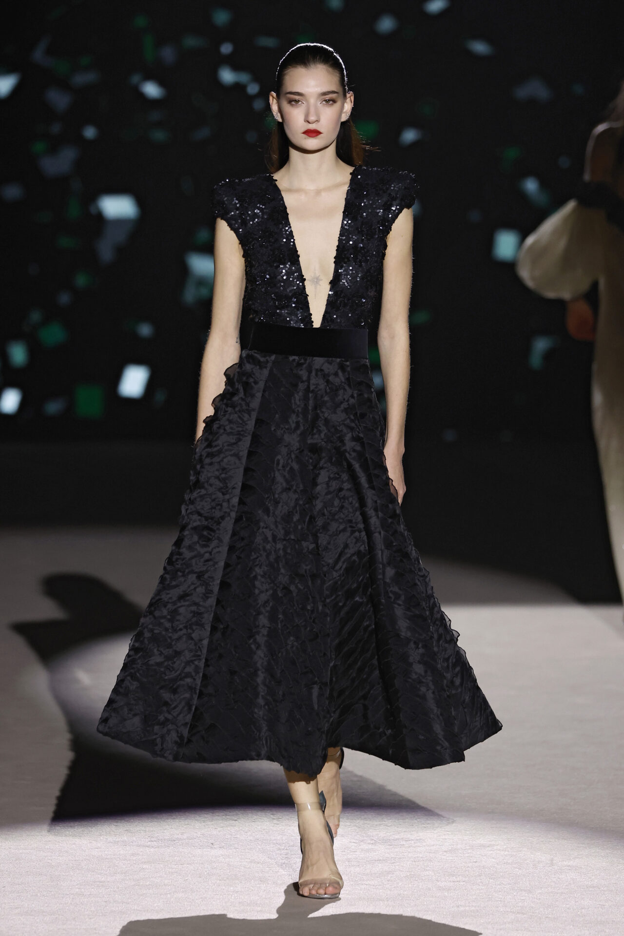 En “Blacknoir” el negro se manifiesta de múltiples formas: a veces absoluto, otras, insinuado en detalles y bordados que contrastan con tonos naturales. Trazando líneas que flotan sobre paños desnudos, espirales geométricas en relieve o gorgueras plisadas a modo de volantes. La silueta se percibe escultural con cuerpos que se quiebran en pliegues estratégicos y vestidos de líneas arquitectónicas.