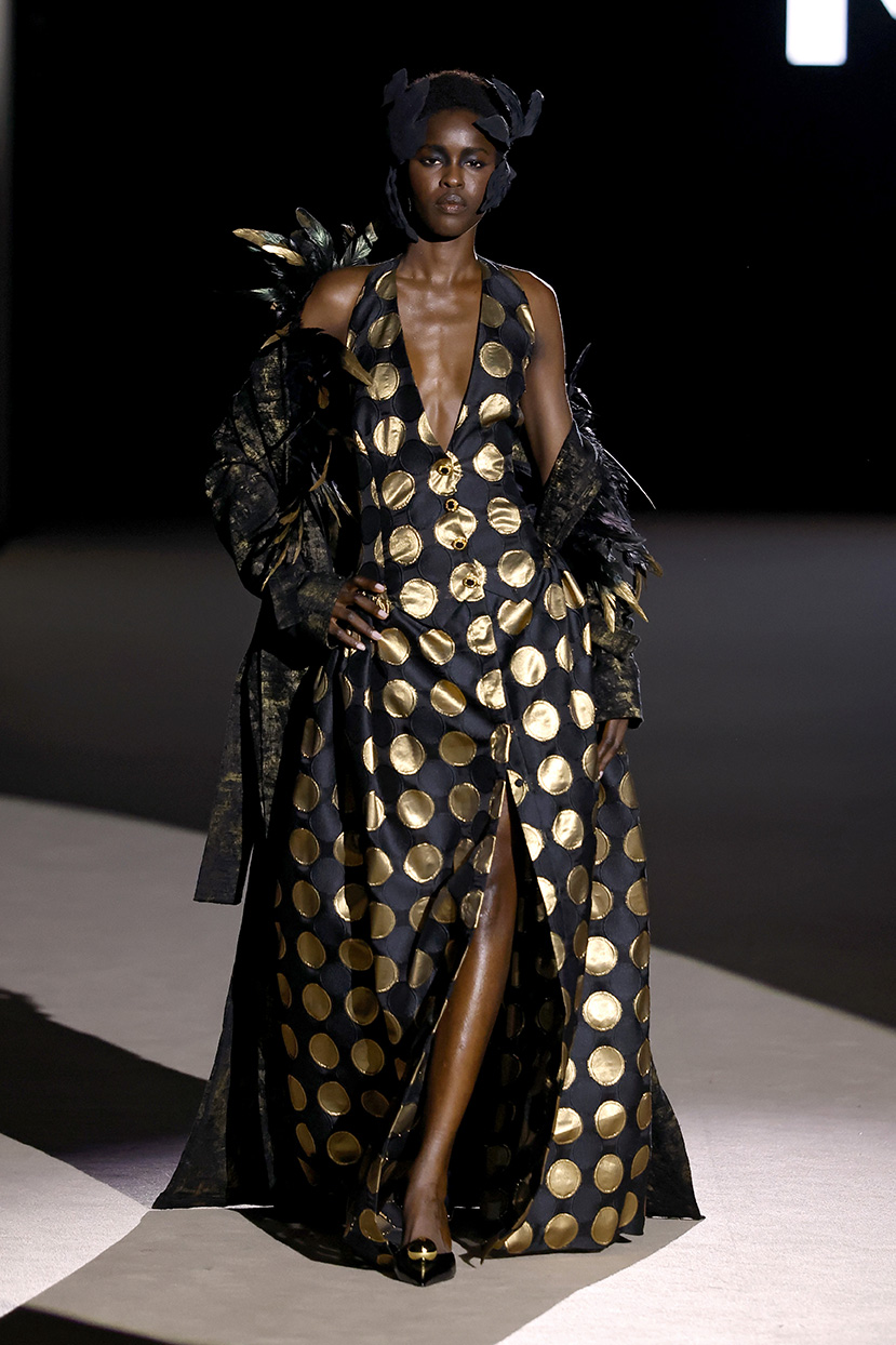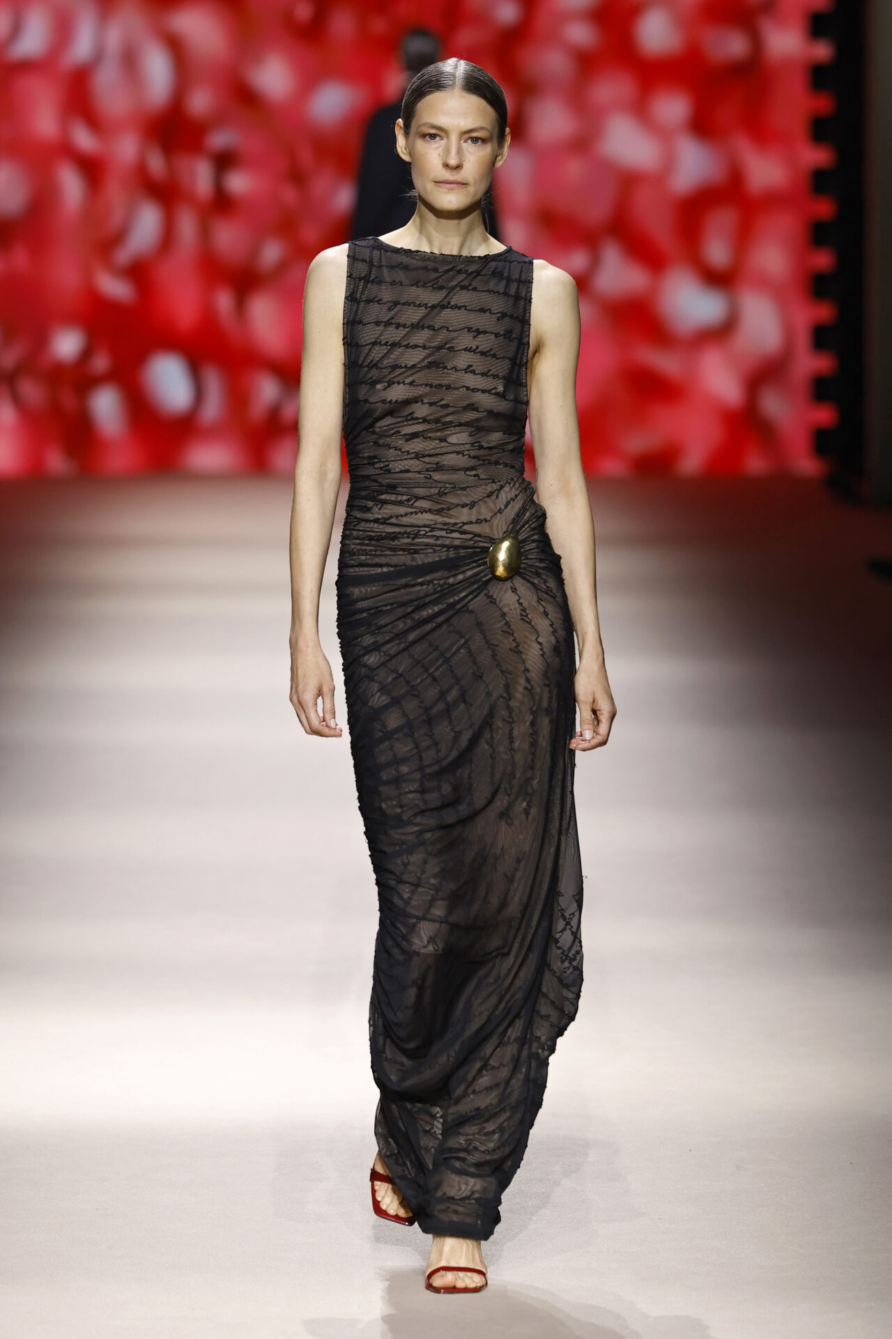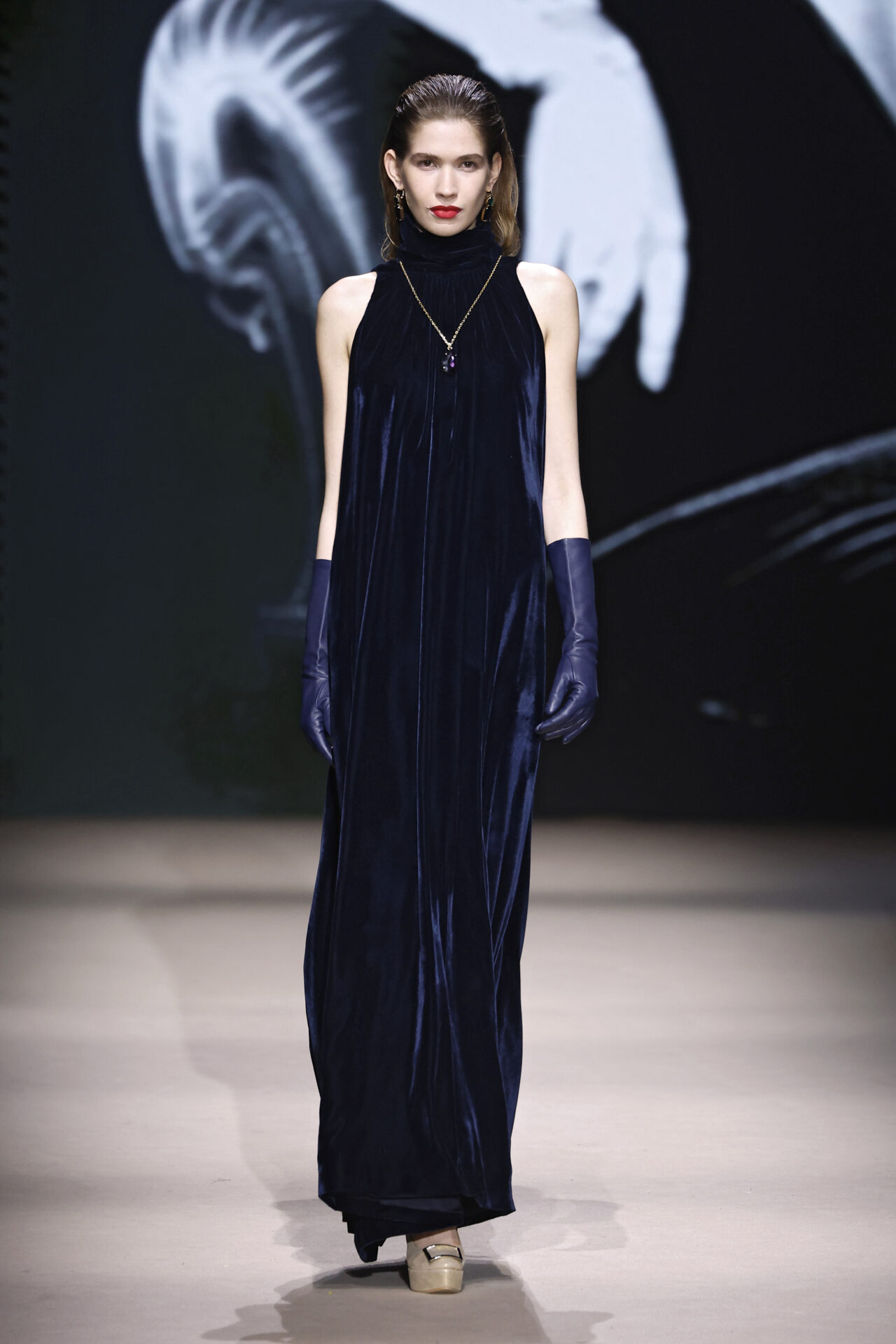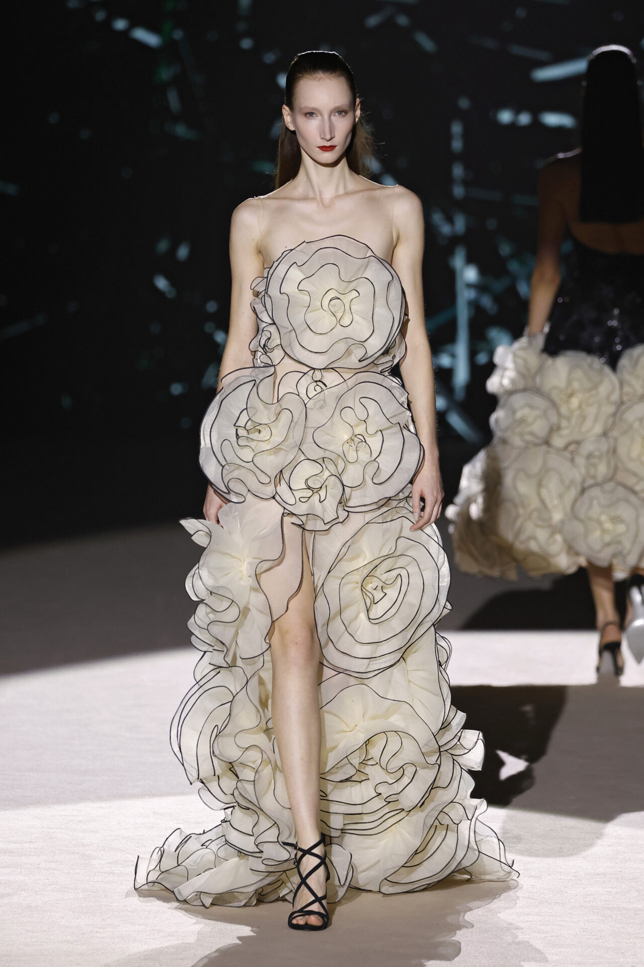 En “Blacknoir” el negro se manifiesta de múltiples formas: a veces absoluto, otras, insinuado en detalles y bordados que contrastan con tonos naturales. Trazando líneas que flotan sobre paños desnudos, espirales geométricas en relieve o gorgueras plisadas a modo de volantes. La silueta se percibe escultural con cuerpos que se quiebran en pliegues estratégicos y vestidos de líneas arquitectónicas.