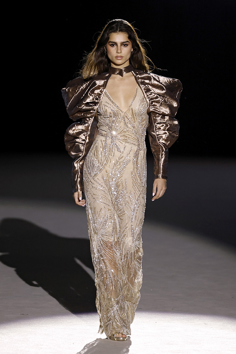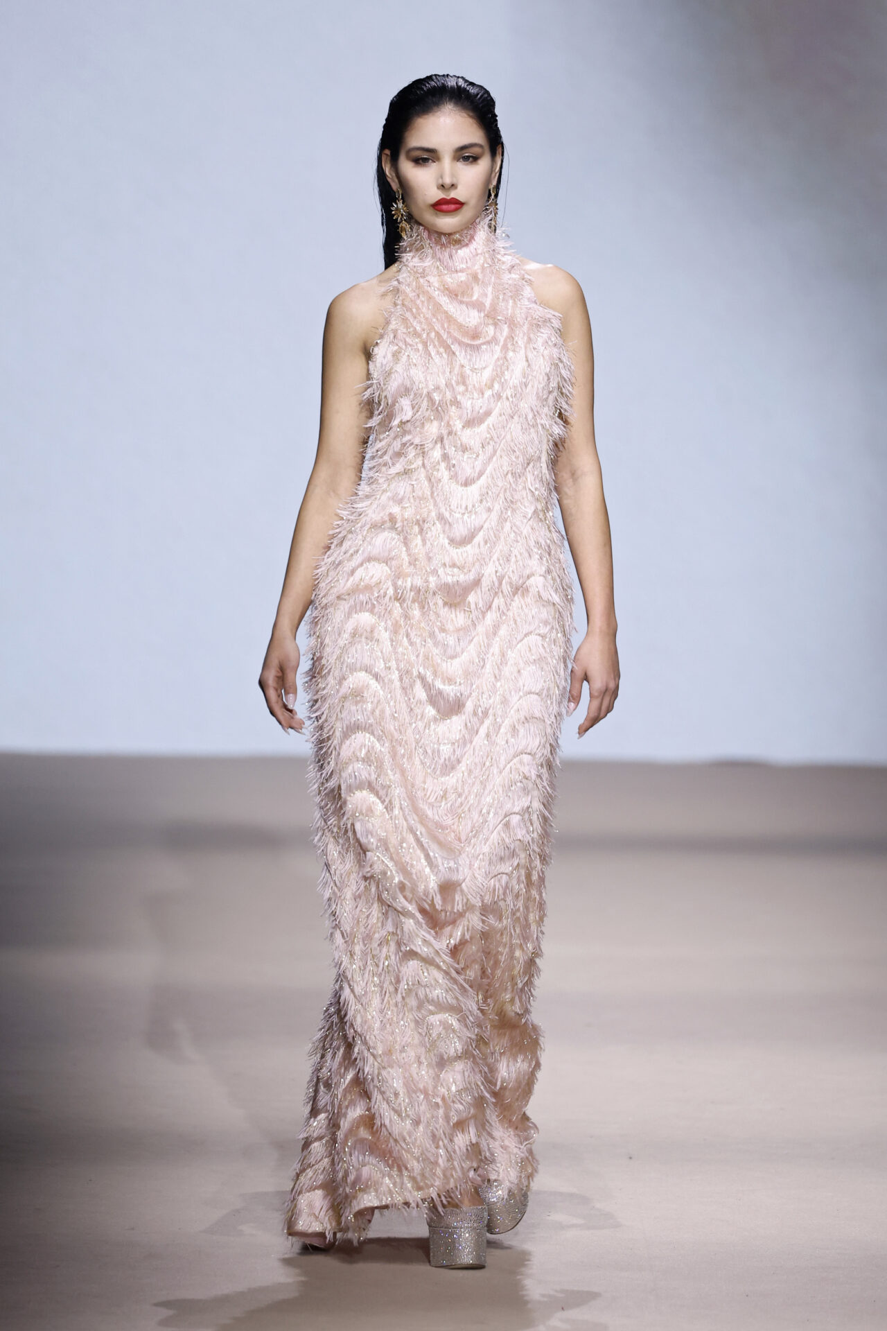 Otro de los elementos a destacar en el desfile son los vestidos que muestran un trabajo artesanal de capas, encajes y patchwork en una paleta cálida de ocres, rosados y dorados, configurando una narrativa visual que fusiona geometría y sensibilidad textil.