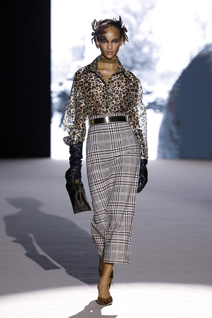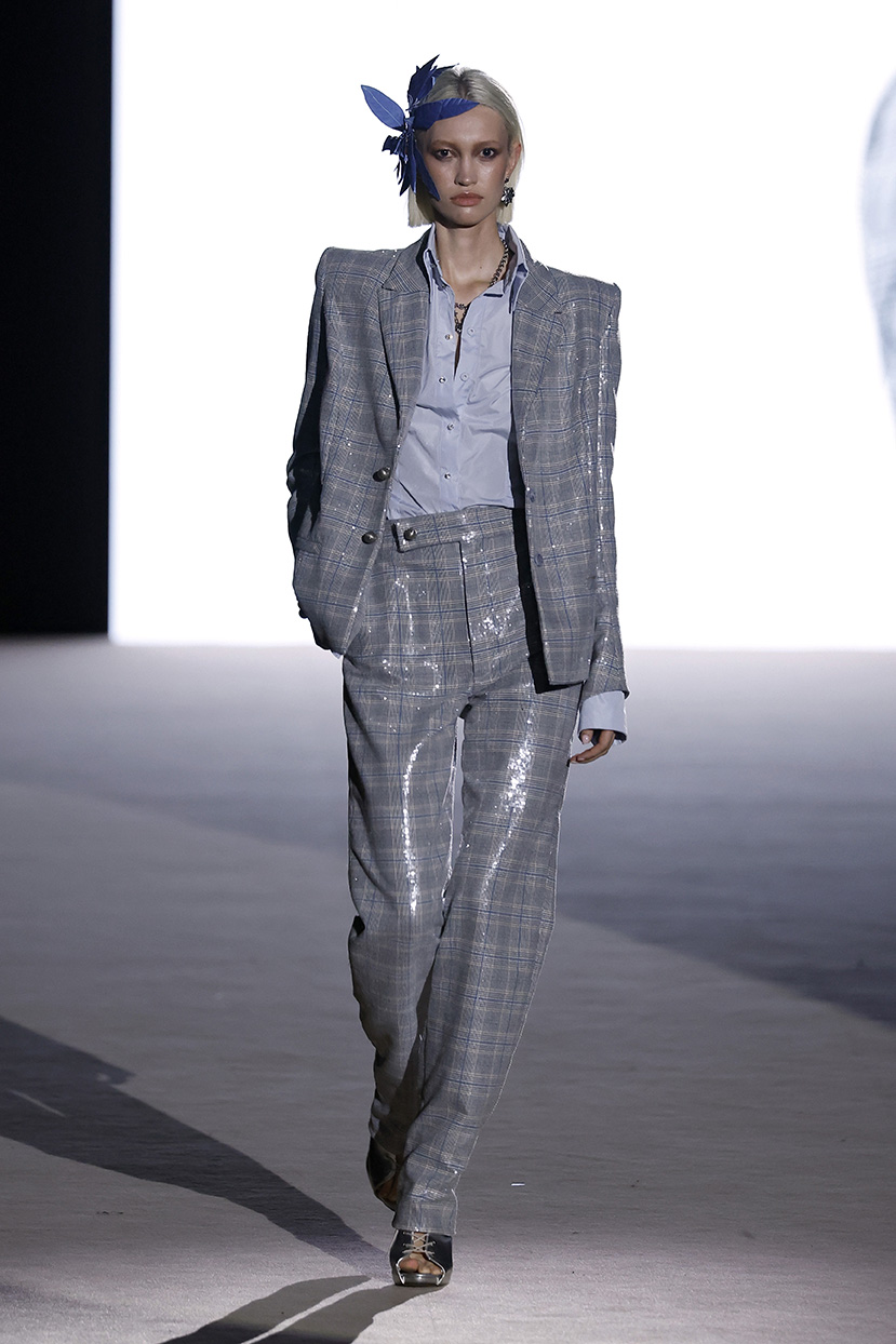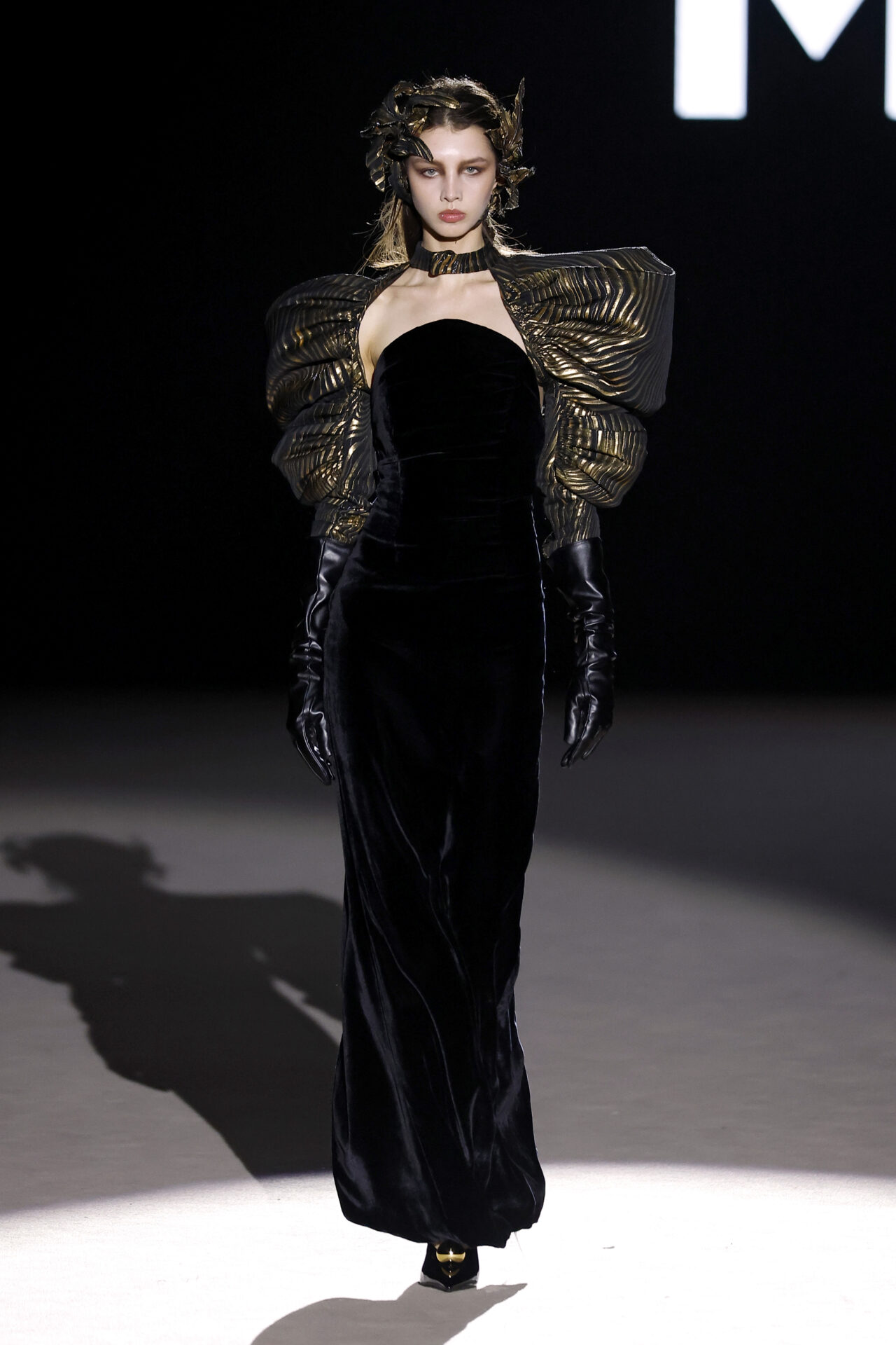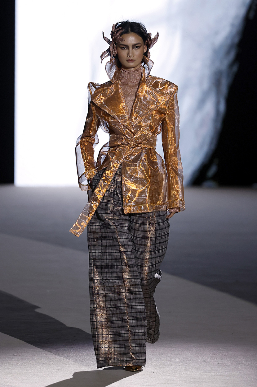 Monos de punto de lúrex con tul de plumeti, tul que se combina a su vez con abrigos de paño de cashmere, vestidos y prendas plisadas junto a paños estampados con degradado de color, antelinas y terciopelos lavables en vestidos y prendas voluminosas con confección y costuras camiseras, más sport. Trasparencias casi invisibles que dejan ver el cuerpo tanto como lo ocultan las microlentejuelas o los terciopelos de algodón en vestidos de noche que evolucionan y juegan con volúmenes en tejidos de tul bordado consigo mismo y en pedrería. Tejidos de lúrex y efecto pluma en ondas de jaquard que nos retrotraen a los años 30 de siglo pasado, terminando con novi@s en terciopelo blanco y lentejuelas” Fotos: MBFWM