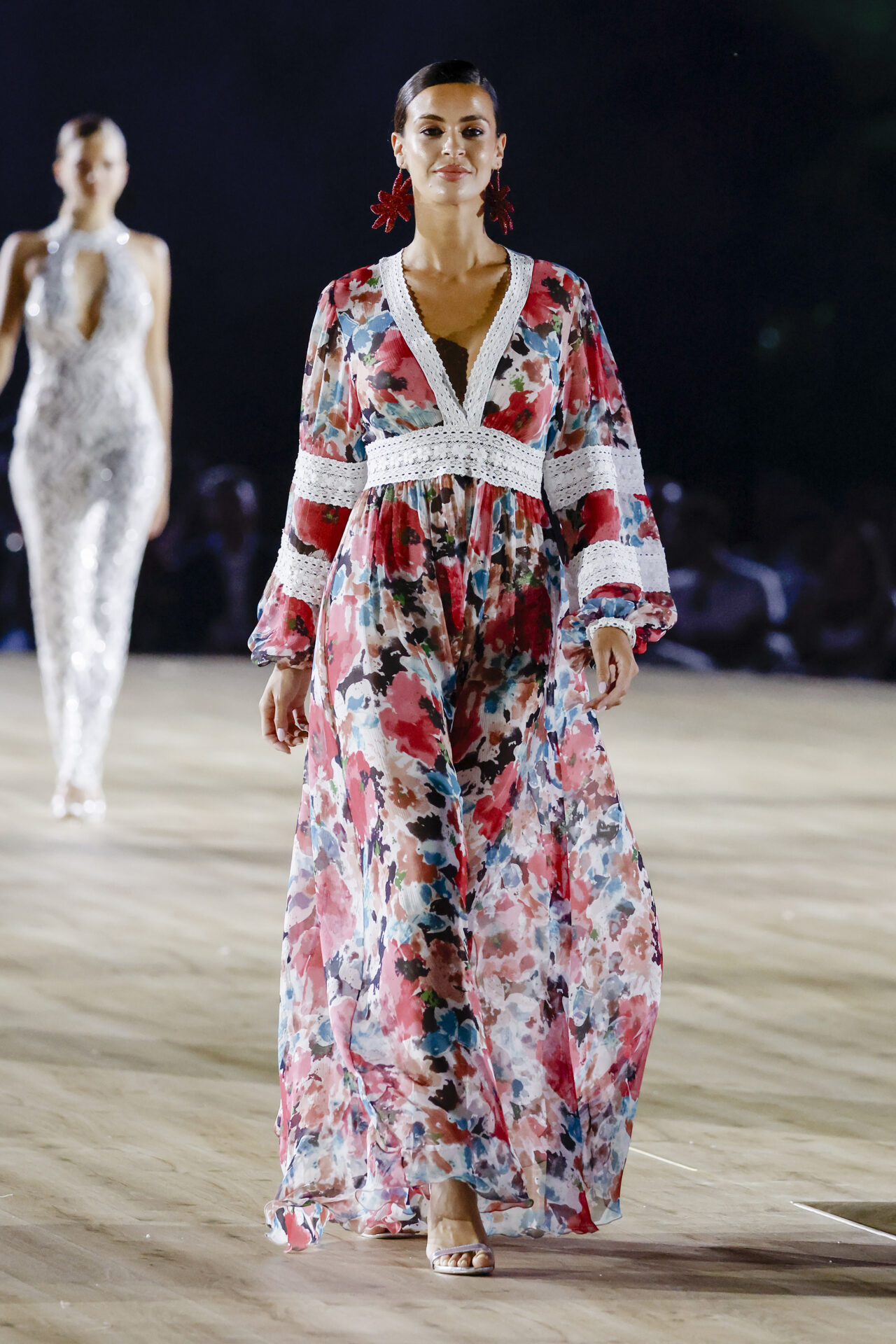 Doce diseñadores han mostrado sus propuestas bajo las estrellas de este maravilloso enclave natural donde las piedras, el aire, el cielo y su luz inigualable se han fusionado con una moda que tiene que ver con la esencia de la isla con su conexión con la tierra, con el blanco de sus casas el azul de mar mediterráneo y más que todo con esas inigualables puestas de sol que tiñen la isla de una gama de colores ocres y la embellecen de tal manera que podríamos pensar que estamos en el Jardín del Edén.