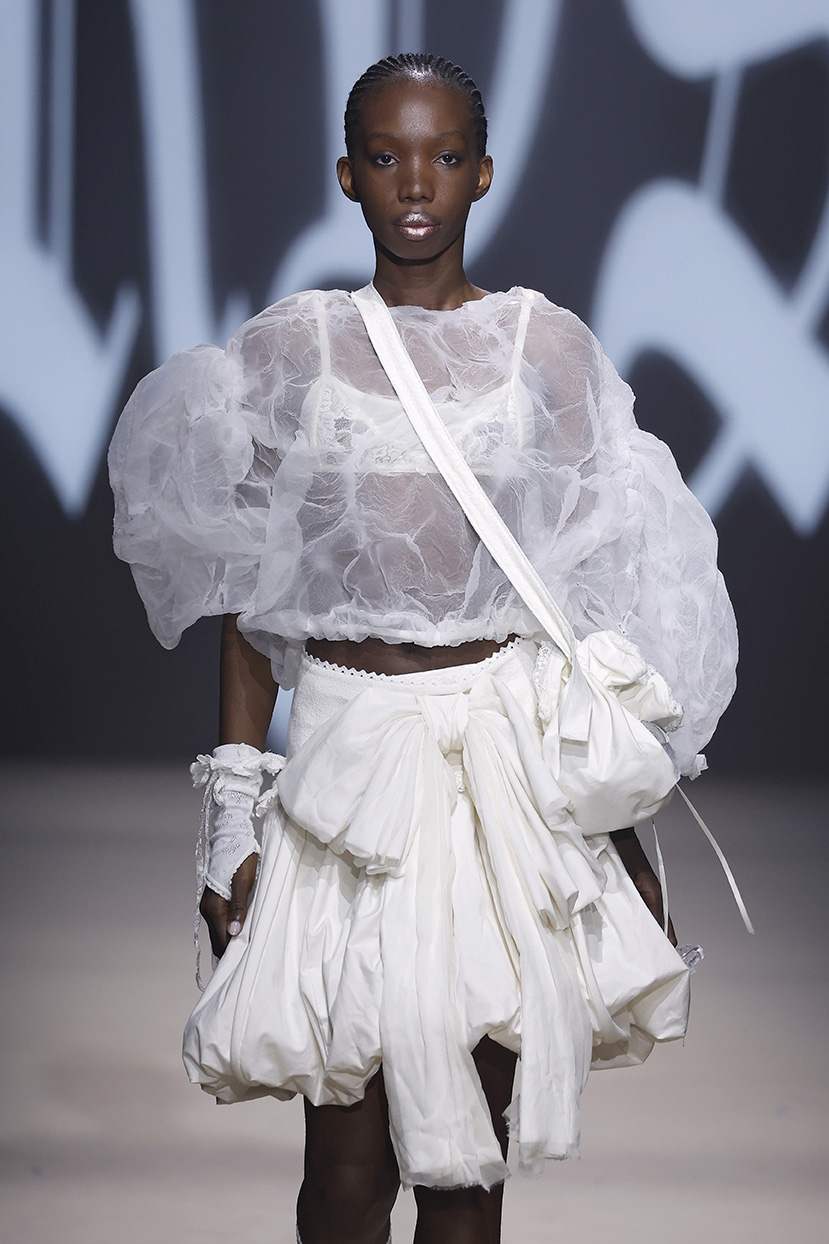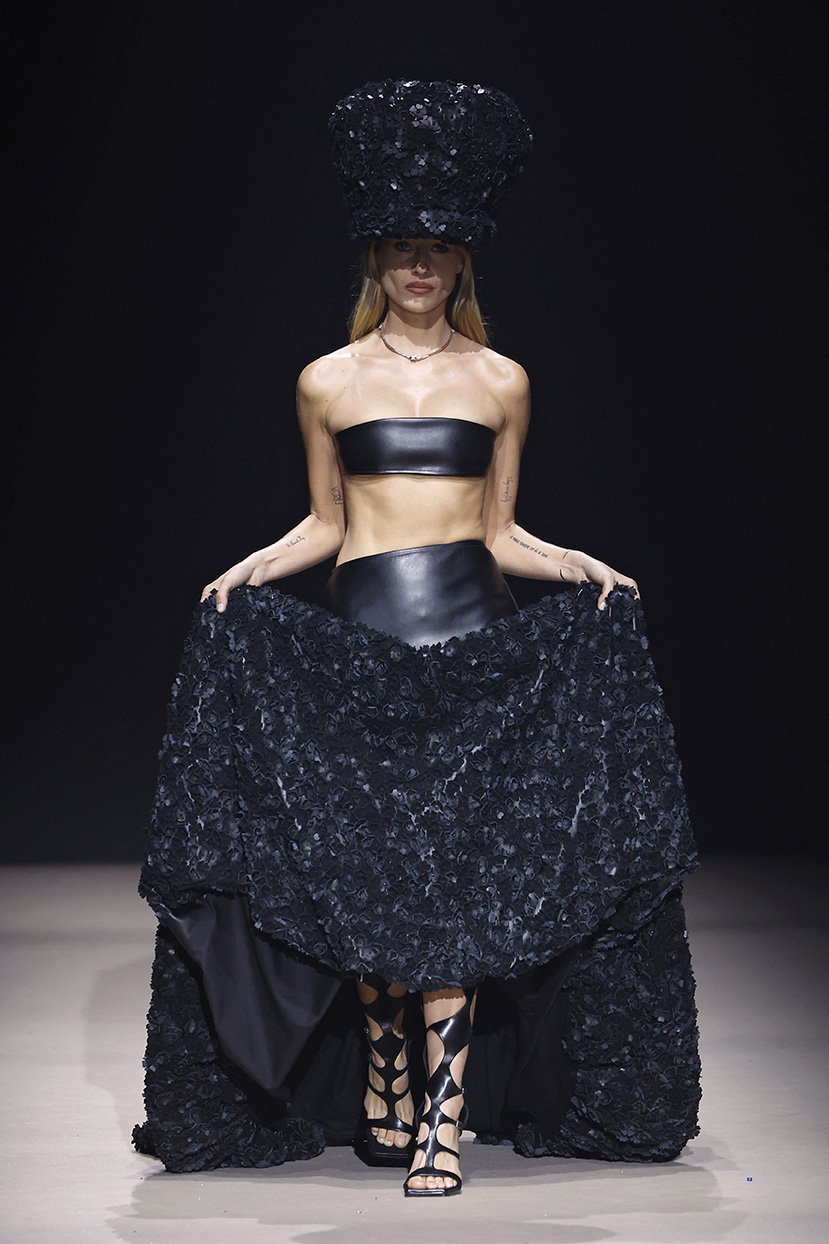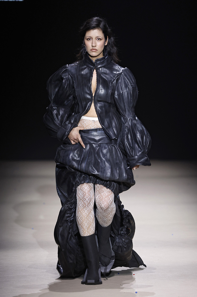 Las prendas se construyen desde el contraste y la convivencia de opuestos, como rigidez y fluidez, peso y ligereza, luz y sombra. Cada silueta funciona como un espacio donde las tensiones no se anulan, sino que dialogan.