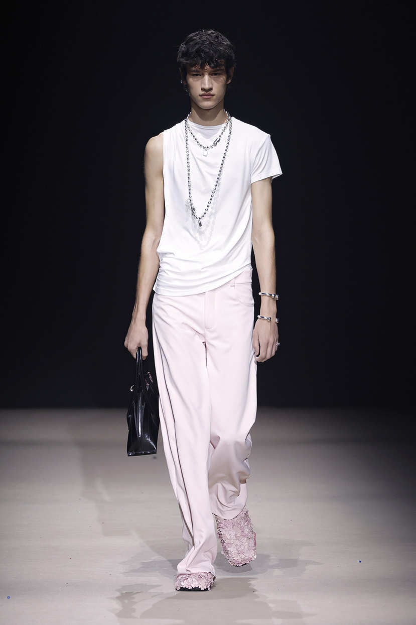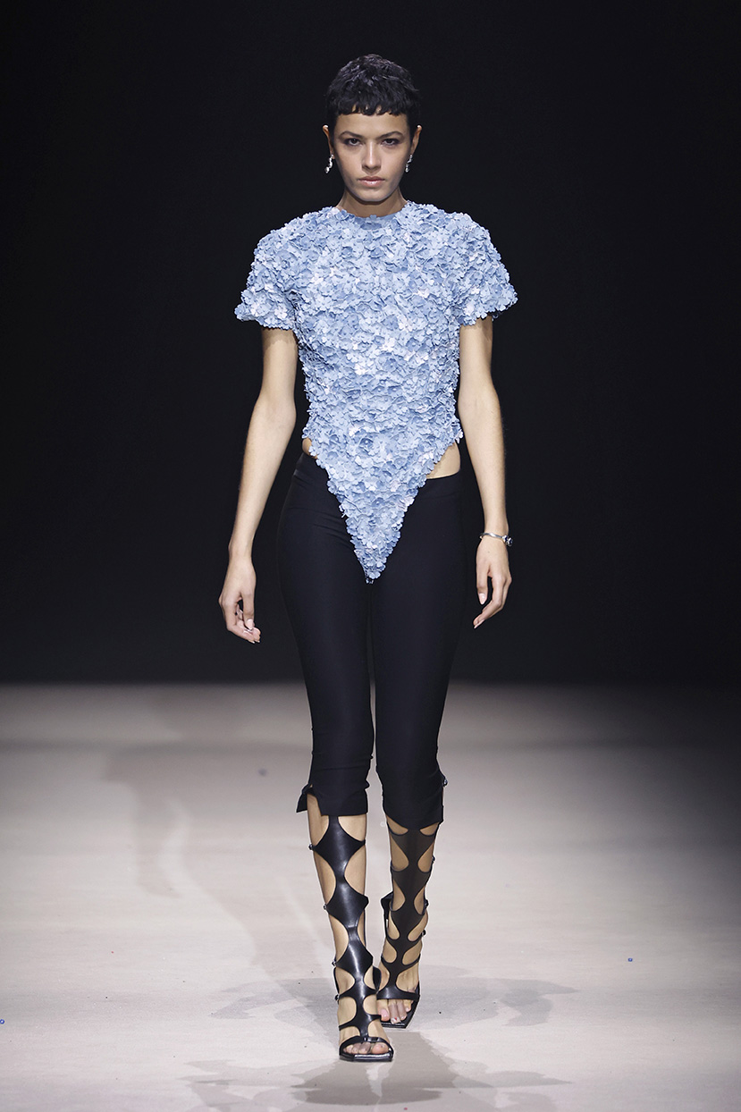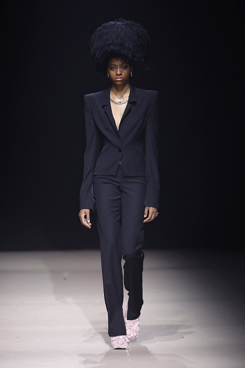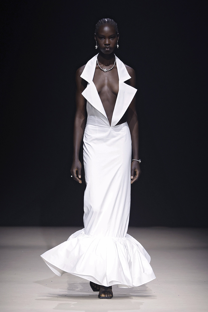 Las prendas se construyen desde el contraste y la convivencia de opuestos, como rigidez y fluidez, peso y ligereza, luz y sombra. Cada silueta funciona como un espacio donde las tensiones no se anulan, sino que dialogan.