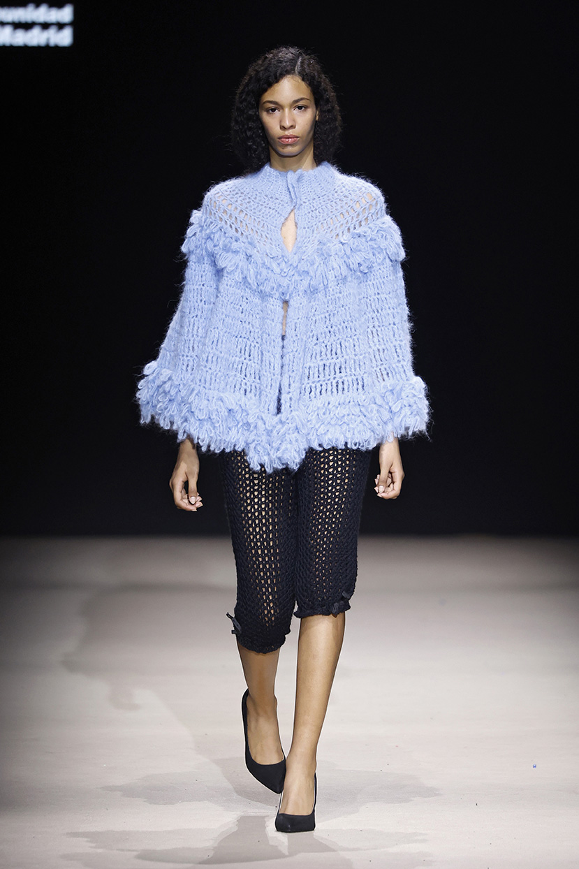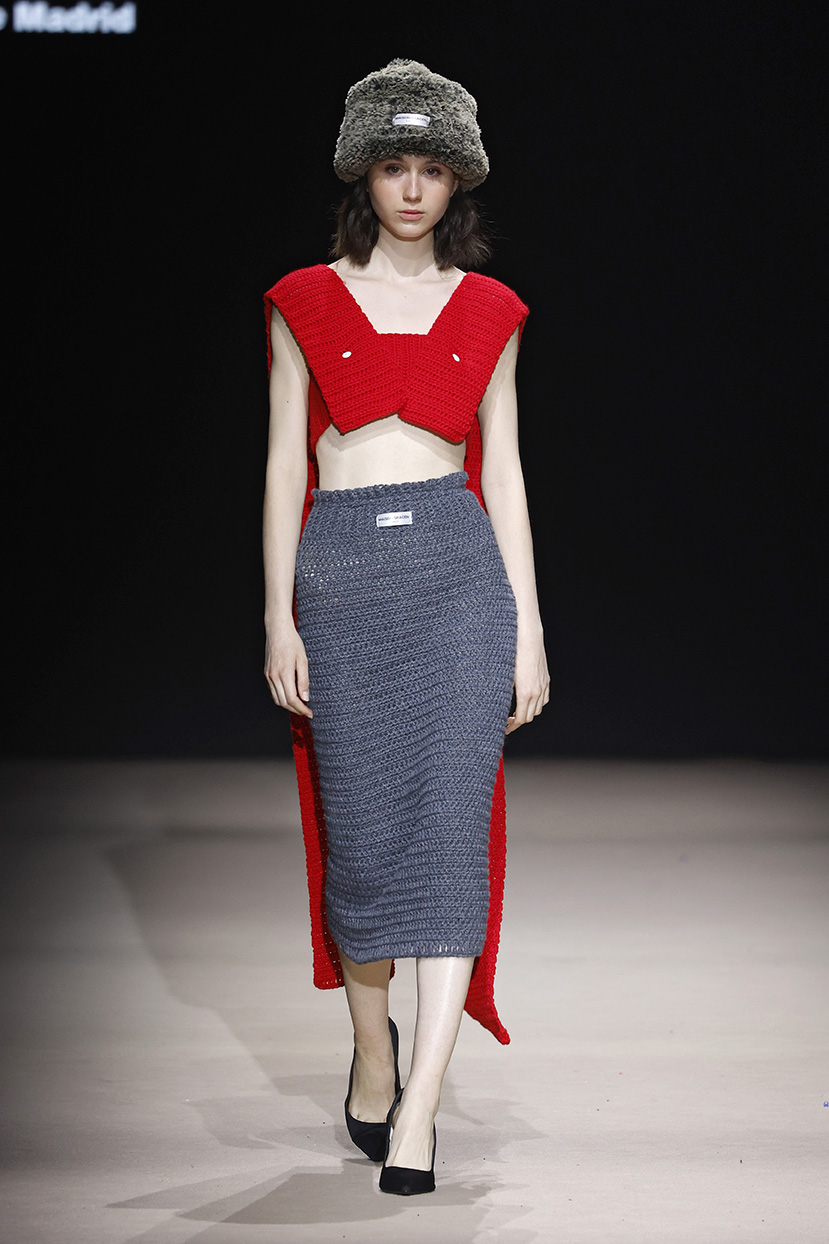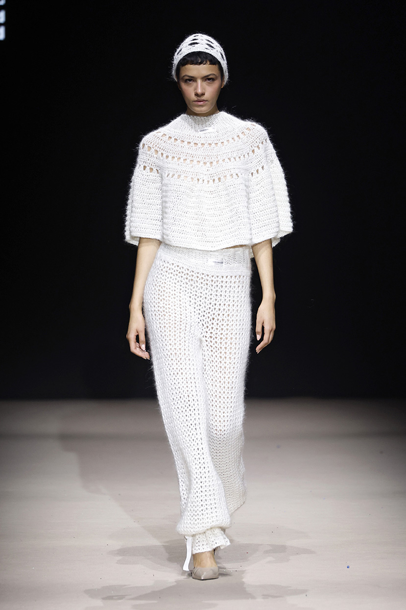 La colección consta de 18 look, 100% tejidos a mano a crochet y acabados de forma artesanal. Un salón casero como Atelier para elaborar a fuego lento una colección que combina culottes con capas, faldas midi de tubo, maxi cuellos y pantalones bombacho, maxi vestidos y gorros